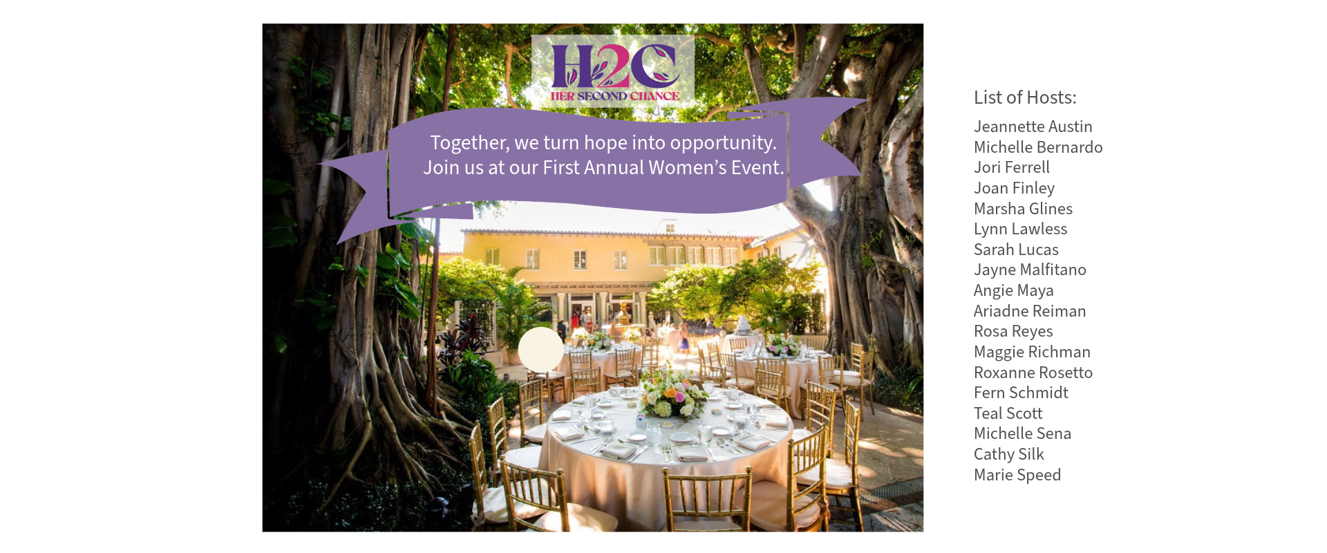 We are honored to welcome our Honorary Chairs, Mrs. Marta Batmasian and Ms. Zoe Lanham, and to present the Her 2nd Chance Award to Mrs. Nancy Pulte Rickard, President and Chairman of the Board of the Pulte Family Charitable Foundation.
