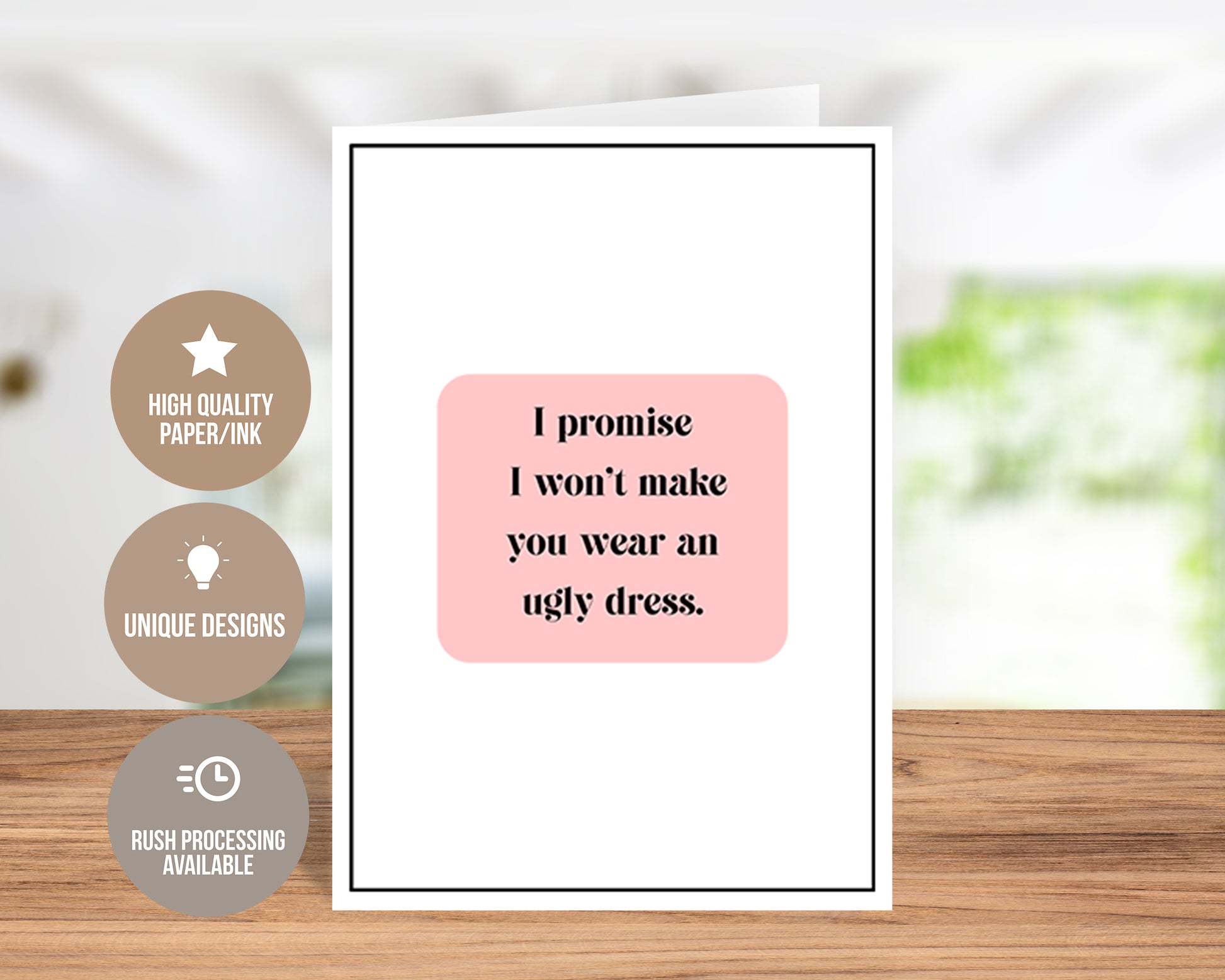 Make your bridesmaid proposal memorable with our exclusive "I Won't Make You Wear An Ugly Dress" greeting card. Crafted with premium quality materials and a touch of sophistication, this card is the perfect way to ask your closest friends to stand by your side on your big day.