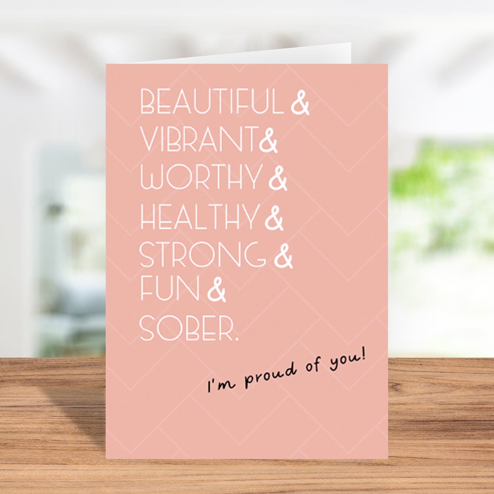 Beautiful, Vibrant, Worthy, Healthy, Strong, Fun, Sober I'm So Proud Of You! Greeting Card.