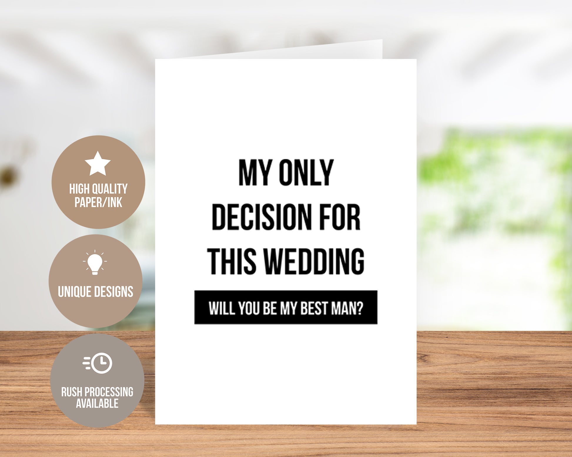 Make your best man proposal unforgettable with our exclusive "My Only Decision, Will You Be My Best Man?" greeting card. Crafted with premium quality materials and sophistication, this best man proposal card is the perfect way to ask your closest friends to stand by your side on your big day.