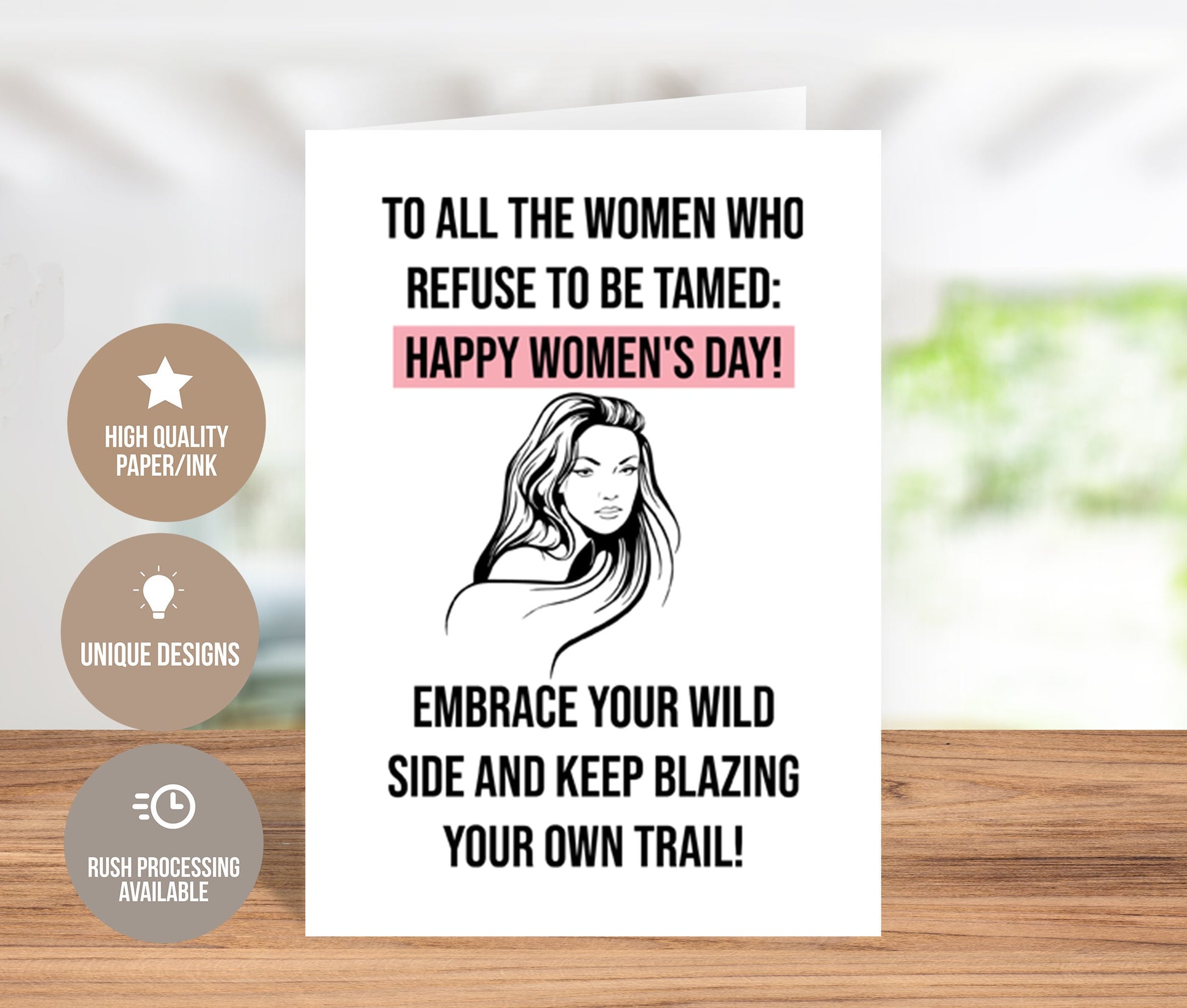 Celebrate the fearless and untamed spirit of women with this empowering greeting card! Featuring a bold message that reads, "To All The Women Who Refuse To Be Tamed: Happy Women's Day Embrace Your Wild Side And Keep Blazing Your Own Trail!" this card honors strength, independence, and the courage to embrace one's true self.