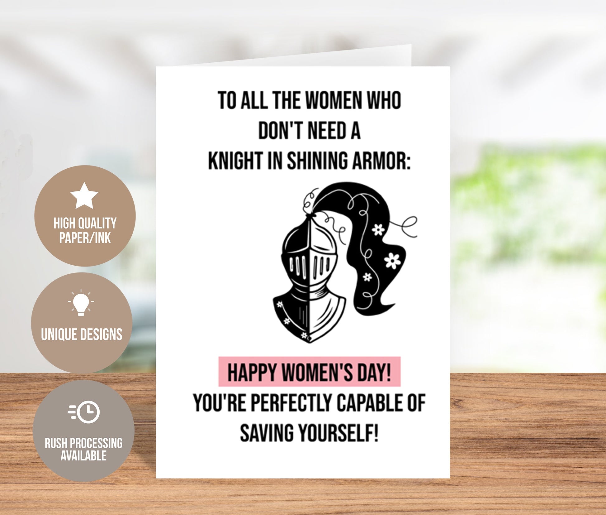 Celebrate the strength and independence of women with this empowering Women's Day card! Featuring a bold message that reads, "To All the Women Who Don't Need a Knight in Shining Armor: Happy Women's Day! You're Perfectly Capable of Saving Yourself!" this card is a powerful tribute to the resilience and courage of women everywhere.