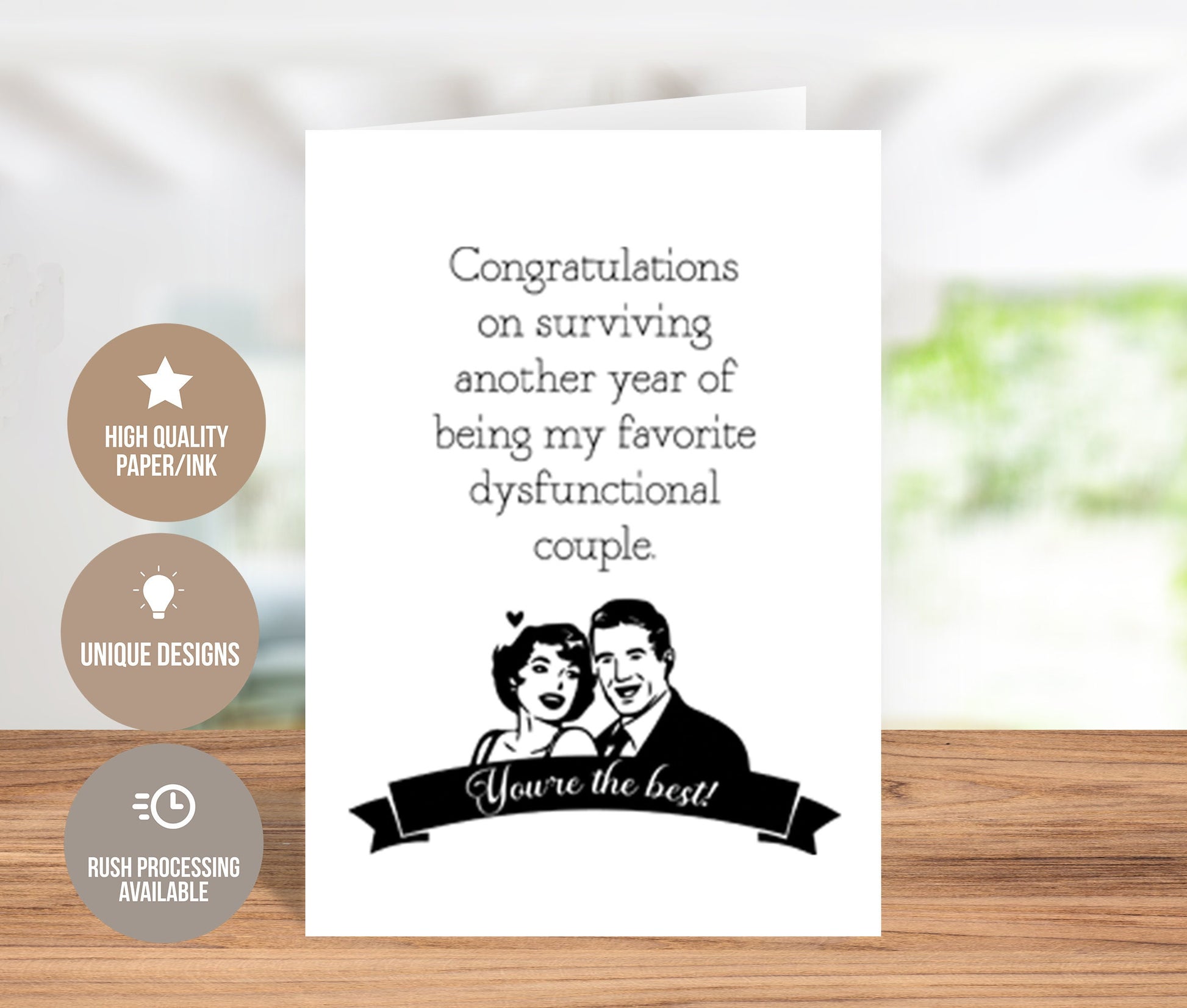 Celebrate the unique bond of your favorite dysfunctional couple with this humorous and heartfelt greeting card! Featuring a witty message that reads, "Congratulations on Surviving Another Year of Being My Favorite Dysfunctional Couple," this card is perfect for acknowledging the ups and downs of love in a lighthearted way.