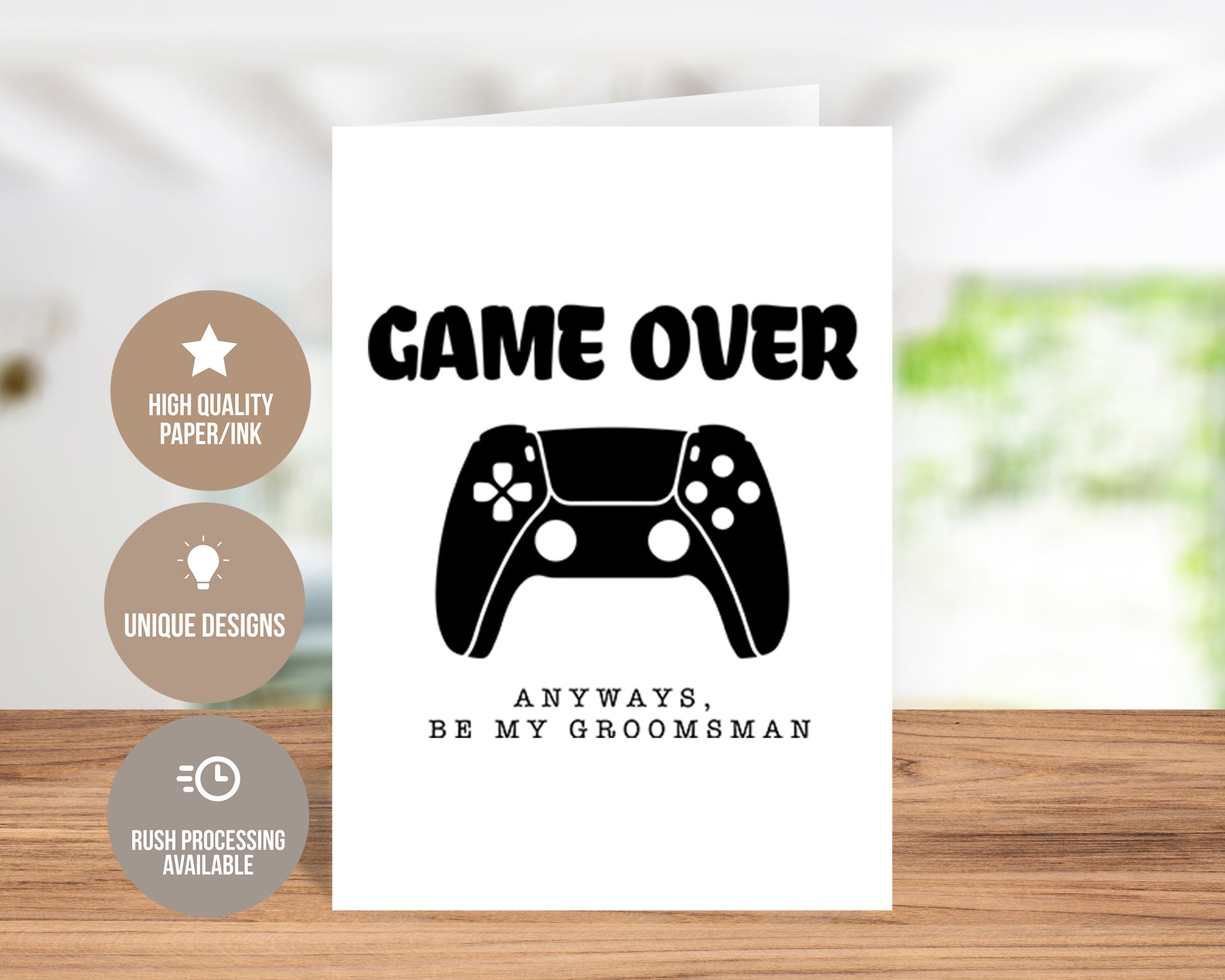Make your groomsman proposal unforgettable with our exclusive "Game Over, Be My Groomsman" greeting card. Crafted with premium quality materials, this card is designed with sophistication to ask your closest friends to stand by your side on your big day. Perfect for any groom looking to make his groomsman proposal as special as possible.
