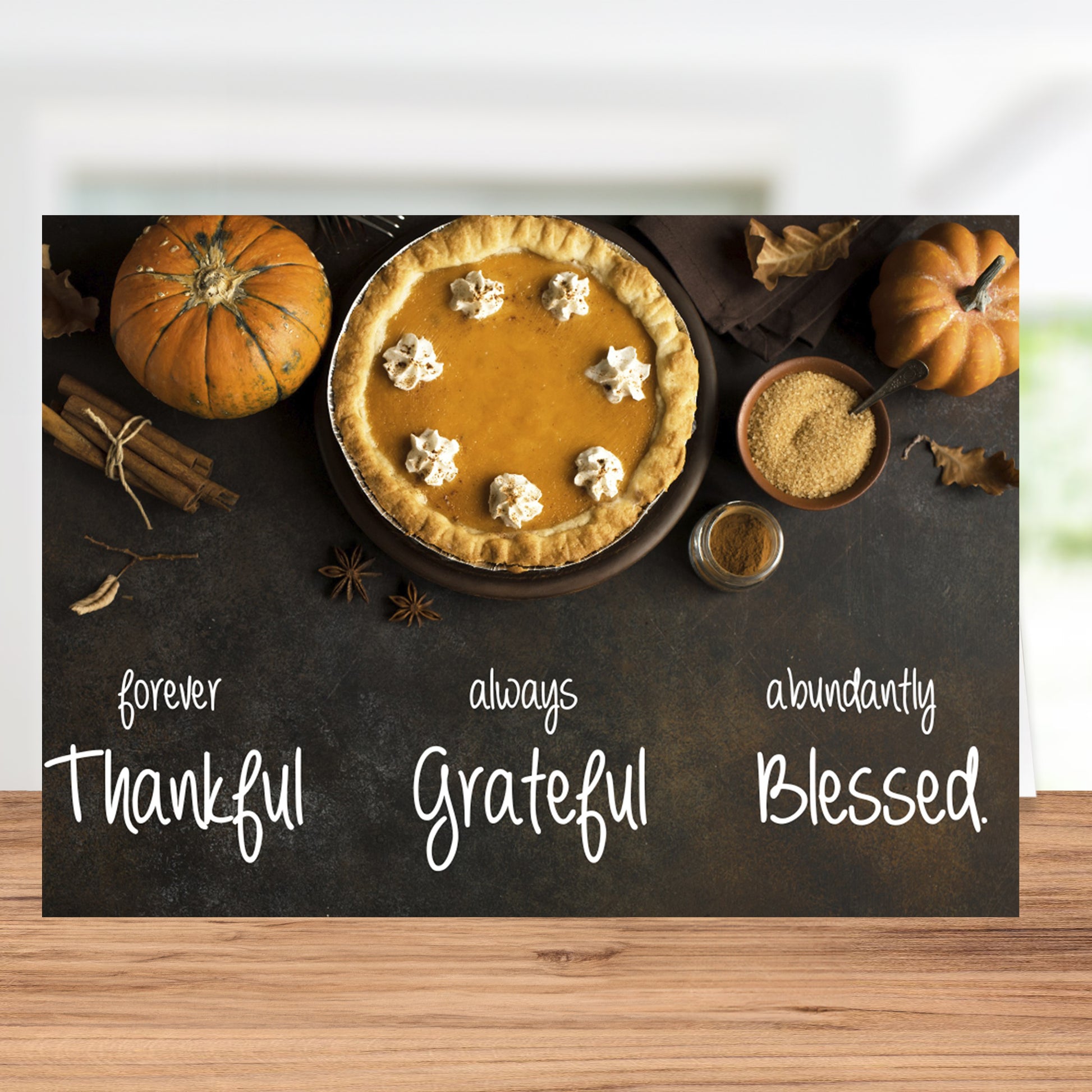 Send warm wishes this Thanksgiving with our beautifully designed card featuring the heartfelt message, "Forever Thankful, Always Grateful, Abundantly Blessed." Adorned with a vibrant full-color image of pumpkin pie, spices, and pumpkins, this autumn card captures the cozy spirit of the season. Perfect for sharing a message of gratitude, whether as a Thanksgiving card for friends, family, or even a card for clients from a business. With its unique design and warm, thankful tone, this card is an ideal way to say "Happy Thanksgiving" and remind loved ones of the blessings in their lives. Give thanks with a card that is as sweet and comforting as the holiday itself!