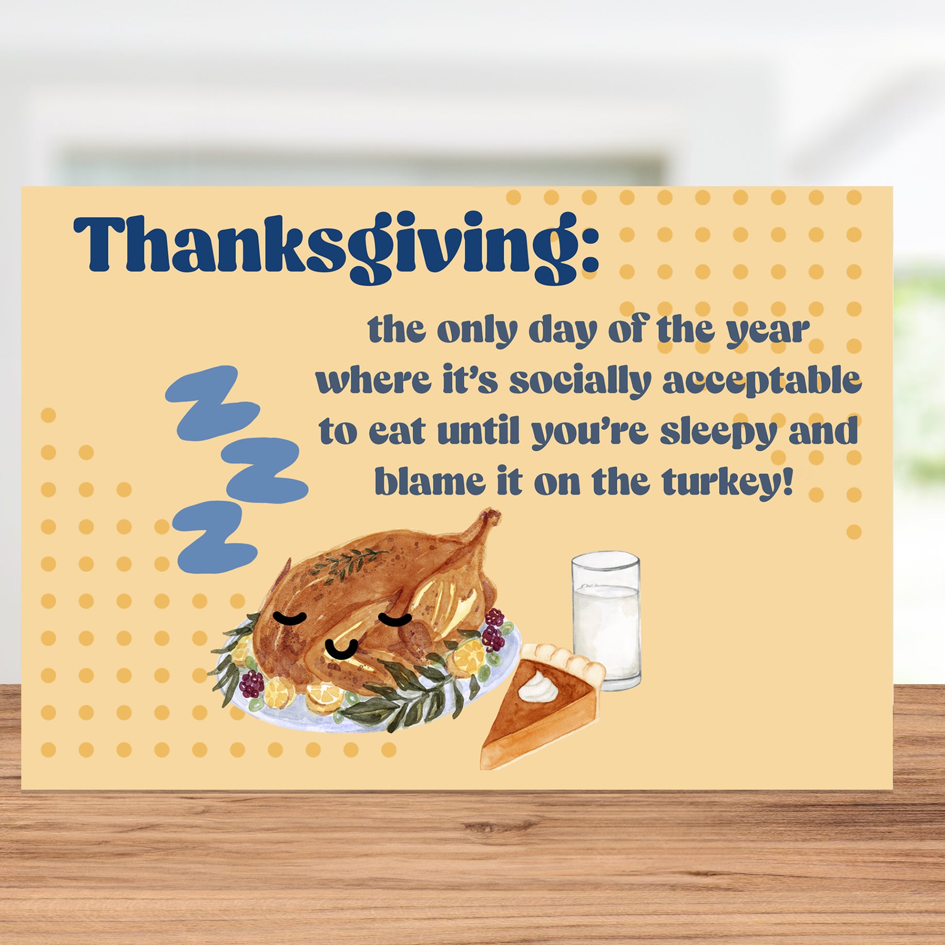 Bring some humor to Turkey Day with this funny Thanksgiving card that reads, "Thanksgiving: the only day of the year where it's socially acceptable to eat until you're sleepy and blame it on the turkey!" This unique autumn card captures the essence of Thanksgiving with its playful take on tryptophan in turkey and the post-dinner drowsiness we all know too well. Perfect as a Thanksgiving gift or a greeting card for someone special, this handmade item features a fun design that will surely bring a smile. Share holiday laughter and give thanks with gratitude, making this card a memorable part of the Thanksgiving tradition!