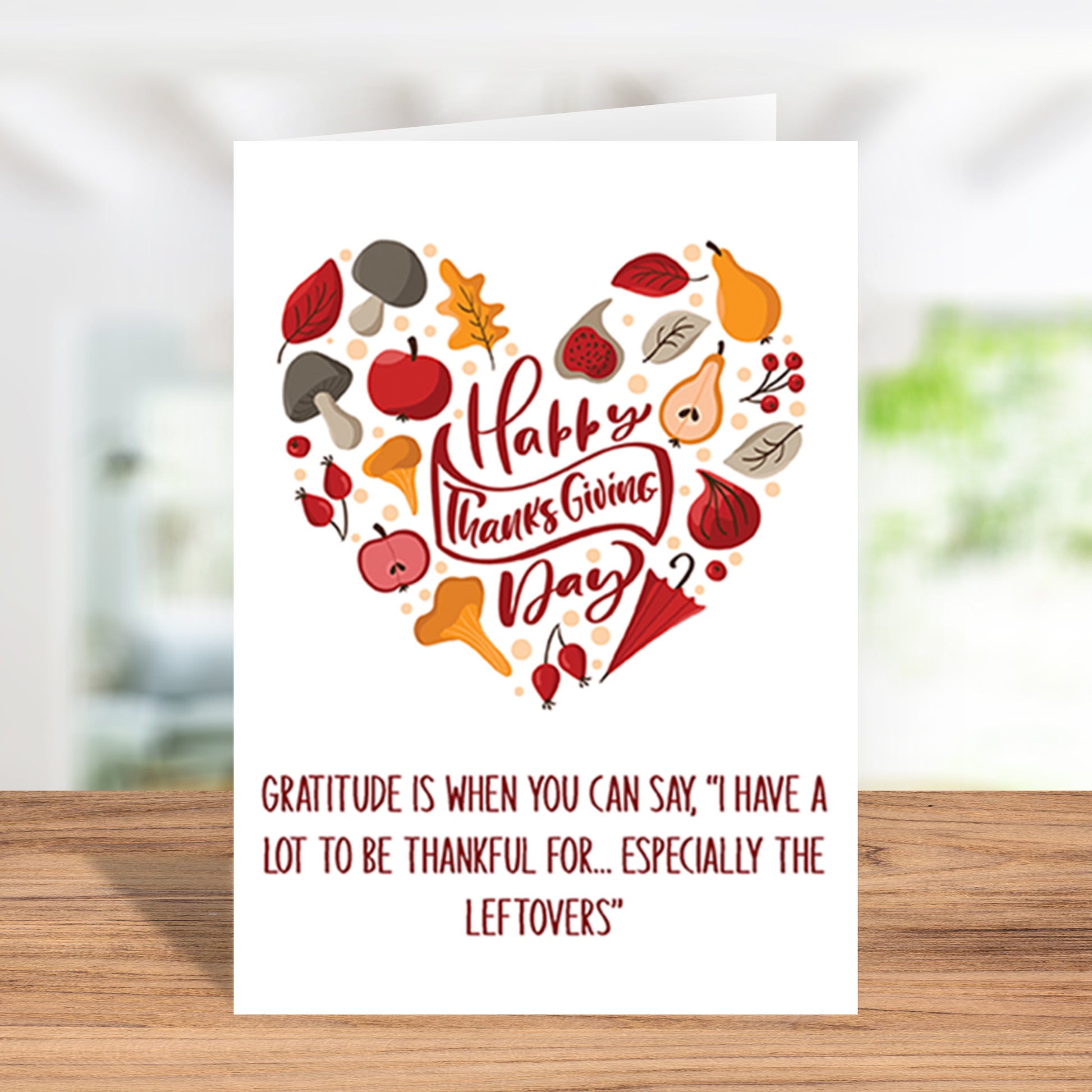 This funny Thanksgiving card is perfect for anyone who appreciates the joy of Thanksgiving dinner—especially the leftovers! With the humorous message, "Gratitude is when you can say 'I have a lot to be thankful for... Especially the leftovers!'" this Thanksgiving card adds a playful touch to Turkey Day. As a handmade item, it’s a unique way to send warm wishes and share some laughs during the holiday season. The fun design makes it stand out among fall greeting cards and autumn cards, and it’s ideal for those who love a little humor with their Thanksgiving dinner. Send this humorous card to remind loved ones to be thankful for the small joys—like leftovers!