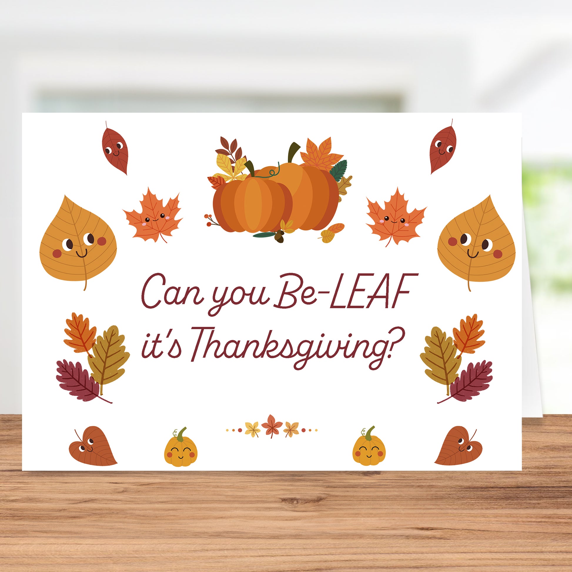 Celebrate the holiday season with a playful twist using our "Can You Be-LEAF It's Thanksgiving?" greeting card. This funny card is perfect for spreading laughter and joy at Thanksgiving dinner or as a festive party invitation. It adds charm to your holiday decor and makes a great card to send to a friend. Whether you're sending positive vibes or looking for a unique Thanksgiving card, this fall card will bring a smile to anyone's face. Ideal for the holiday season, it pairs perfectly with your Thanksgiving decor and holiday celebrations!
