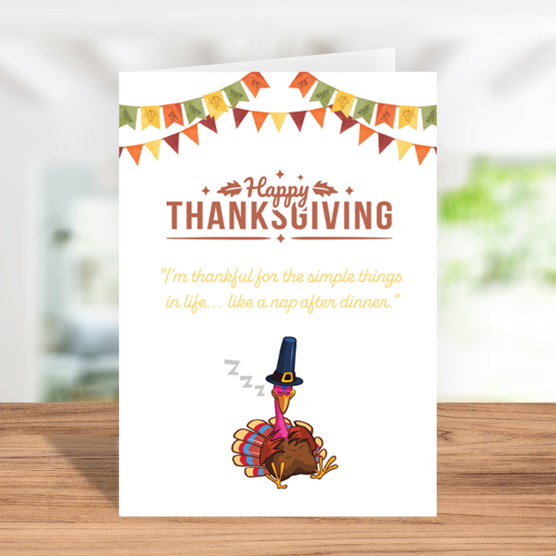 Send warm wishes this holiday season with our "Happy Thanksgiving I'm Thankful for the Simple Things in Life... like a Nap After Dinner" greeting card. Perfect for celebrating Turkey Day, this humorous card adds a lighthearted touch to your Thanksgiving decor. Whether you're sending a thoughtful message to family and friends or using it as a party invitation for your holiday party, this Thanksgiving card is sure to bring a smile. Ideal for family dinners, it captures the joy of Thanksgiving dinner while adding a sprinkle of fun to your fall decor. Spread happy holidays and season greetings with this delightful and funny greeting card!