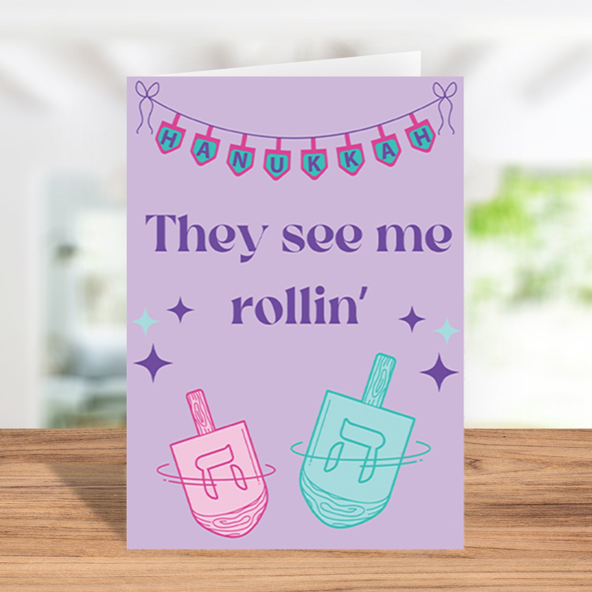 Bring humor and vibrant holiday cheer to the Festival of Lights with this "They See Me Rollin'" Hanukkah card, featuring a colorful dreidel design that’s sure to make anyone smile! Perfect as a funny holiday card for friends and family, this handmade item adds a unique and playful touch to any Jewish holiday celebration. Ideal for gifting alongside Hanukkah presents or as a stand-alone Hanukkah gift, this card captures the joyful spirit of the season in a fresh, creative way. Whether you're looking for a holiday gift for a friend or a gift for a loved one, this funny Hanukkah card is the perfect way to say "Happy Hanukkah" with a wink and a smile!