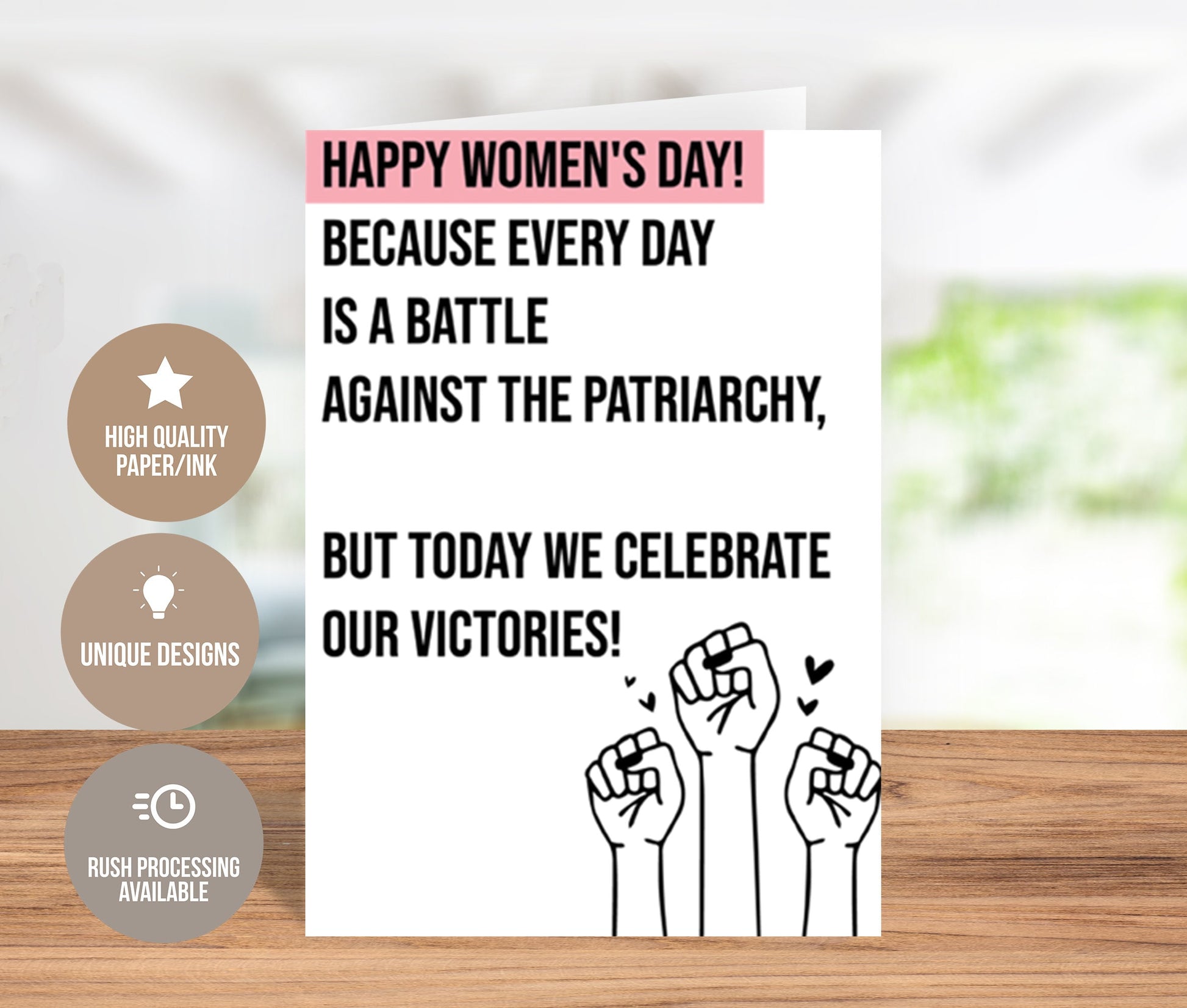 Celebrate Happy Women's Day with this empowering card, honoring the strength and resilience of women everywhere. Featuring the bold message "Celebrating Our Victories Against The Patriarchy," this card recognizes the ongoing fight for gender equality and the triumphs—big and small—of those who continue breaking glass ceilings, challenging stereotypes, and advocating for change. Let this card inspire empowerment and solidarity, making it the perfect way to celebrate International Women’s Day and the achievements of women every day.