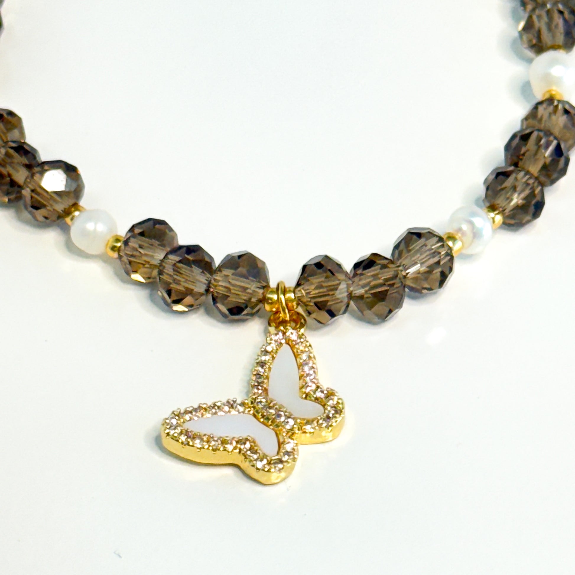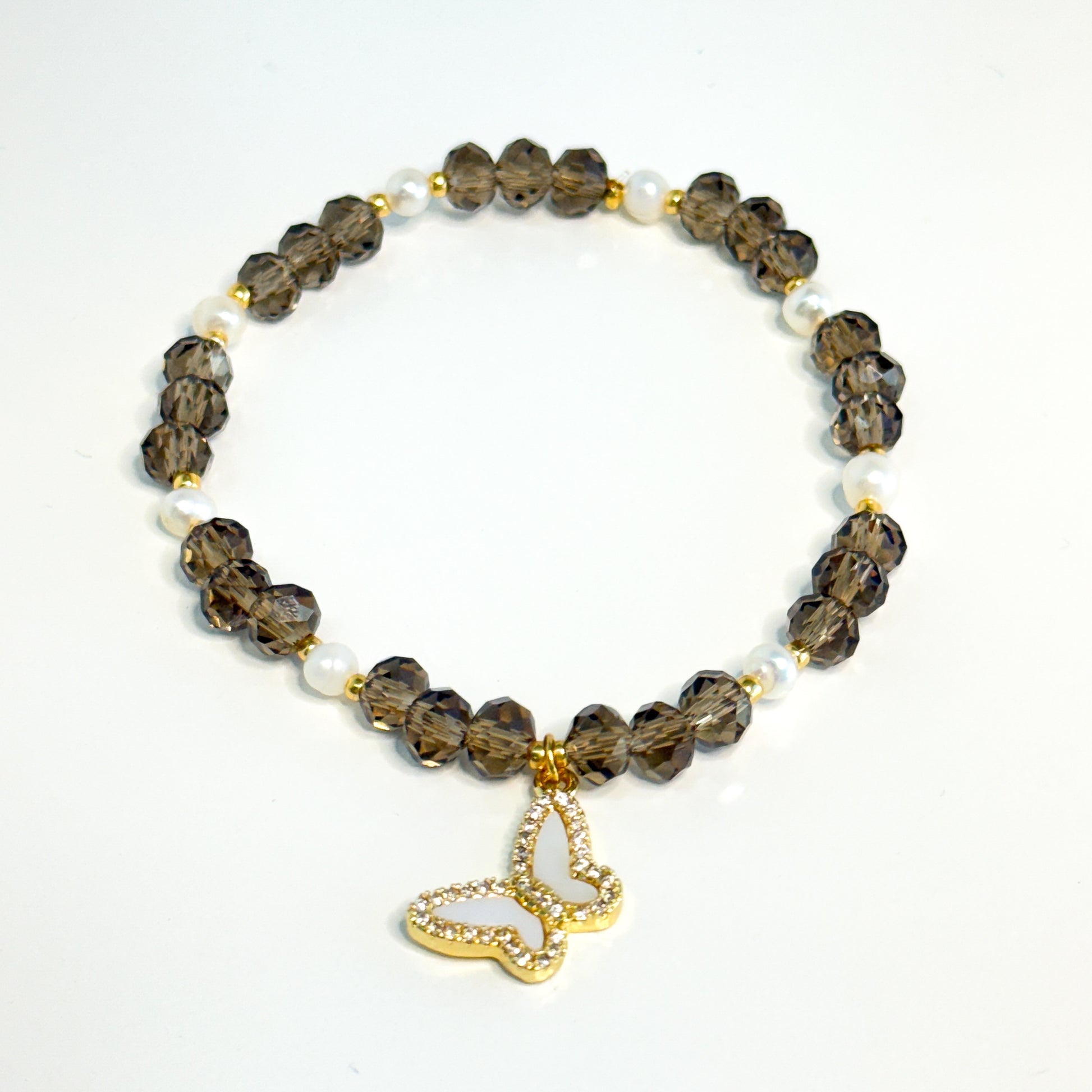 This handmade H2C bracelet is crafted by women in recovery—each piece made with purpose. It features shimmering 6mm smoky crystals, elegant pearls, and gold accent beads, finished with a gold butterfly charm—the symbol of transformation and new beginnings. Each bead is a step of courage; each sparkle, a whisper of hope. Wear it to honor your journey, celebrate a survivor, or keep a loved one close.