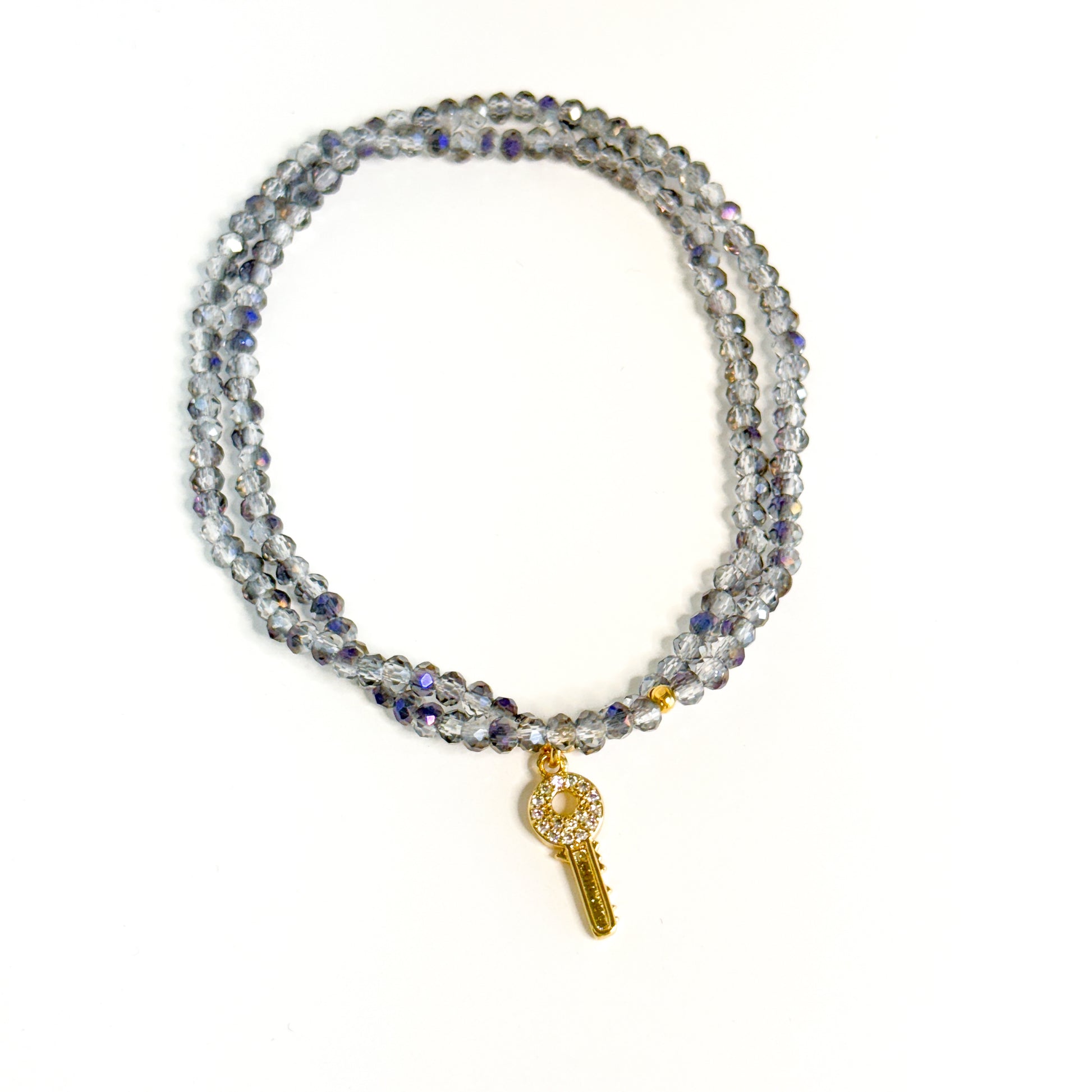 This bracelet was handcrafted with white and soft blue/purple crystals, colors that symbolize clarity, healing, and inner strength. The gold key charm, accented with delicate crystals, represents new beginnings and the power to unlock a brighter future.