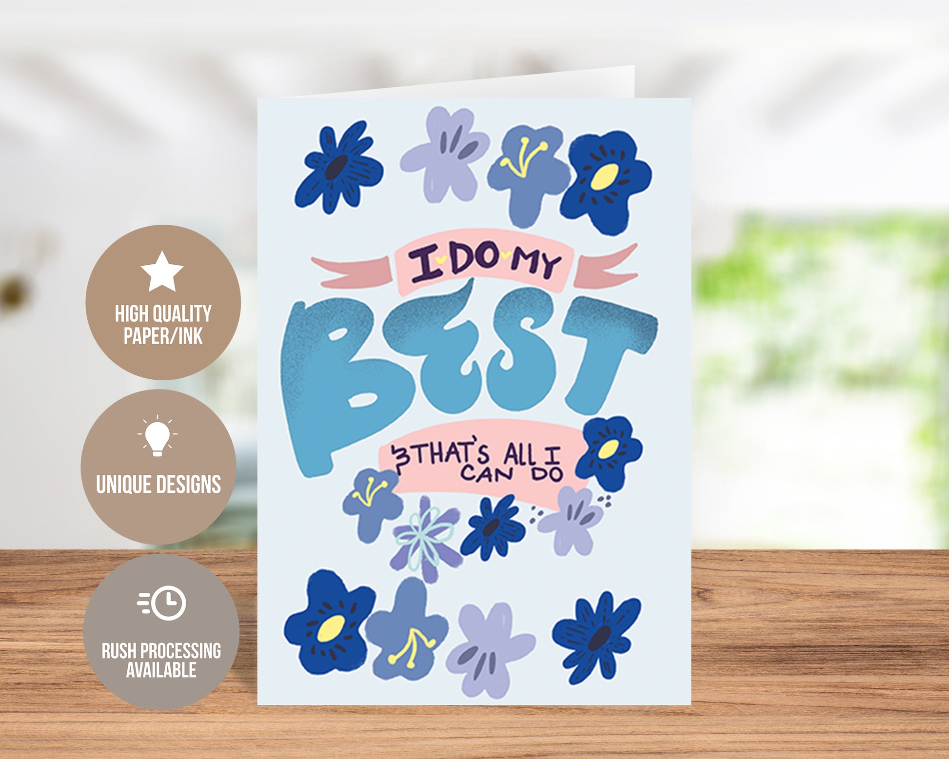 Celebrate resilience and self-compassion with our heartfelt "I Do My Best" greeting card! This motivational greeting card is a gentle reminder that every effort matters, even in the face of challenges. Handcrafted with care, this handcrafted inspirational card is perfect for anyone facing obstacles, striving for progress, or navigating life's ups and downs. Let them know their journey is worth celebrating. Spread kindness and encouragement with this uplifting greeting card. Order now and inspire someone to keep moving forward with confidence and strength!