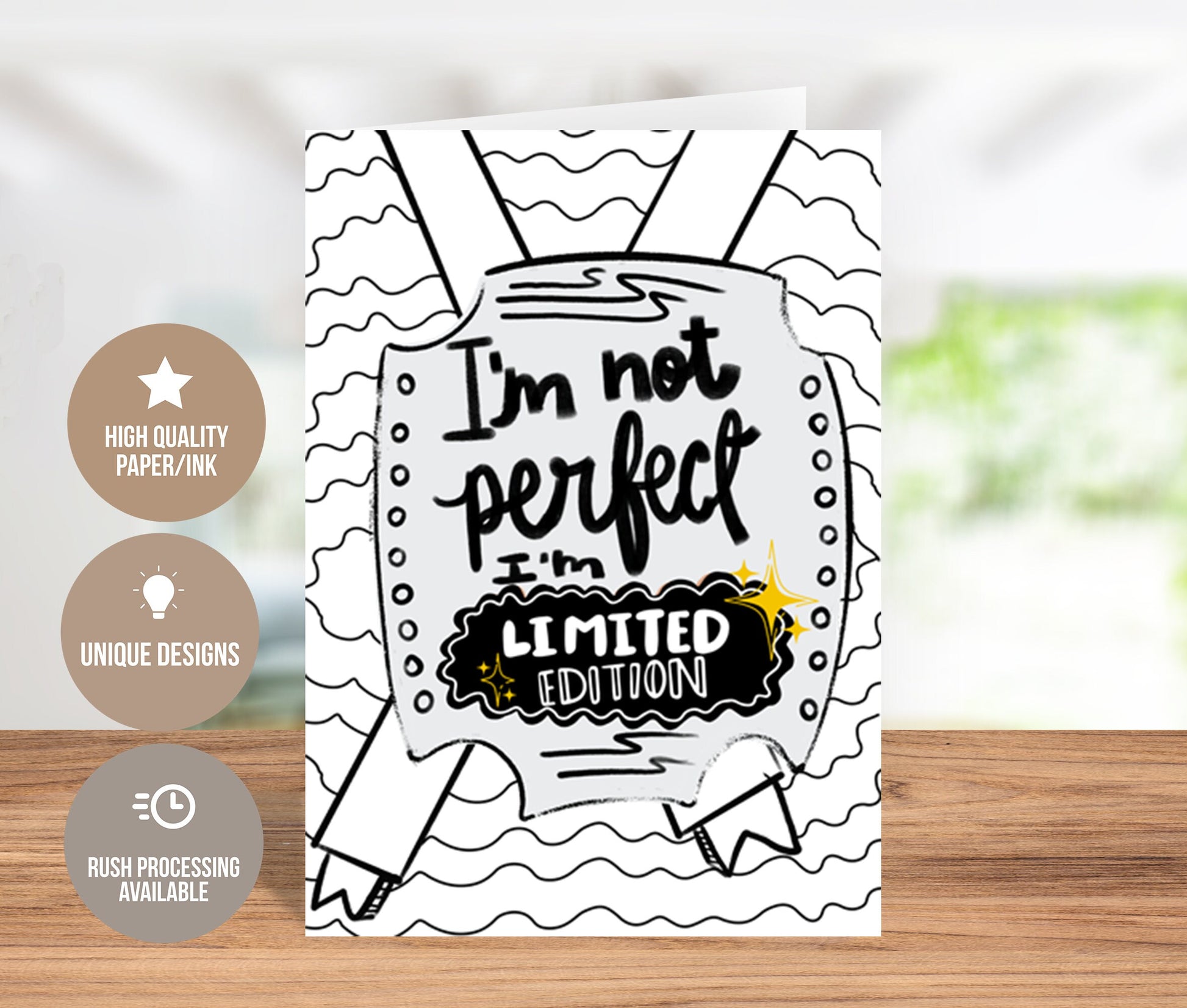 Celebrate your individuality with our I'm Not Perfect I'm Limited Edition Card. This Limited Edition Greeting Card is more than just a piece of stationery; it's a reminder to embrace your imperfections and be your most authentic self. Perfect for sending to friends, family, or anyone who deserves a reminder that they are truly one of a kind, this self-love greeting card spreads confidence and encouragement.