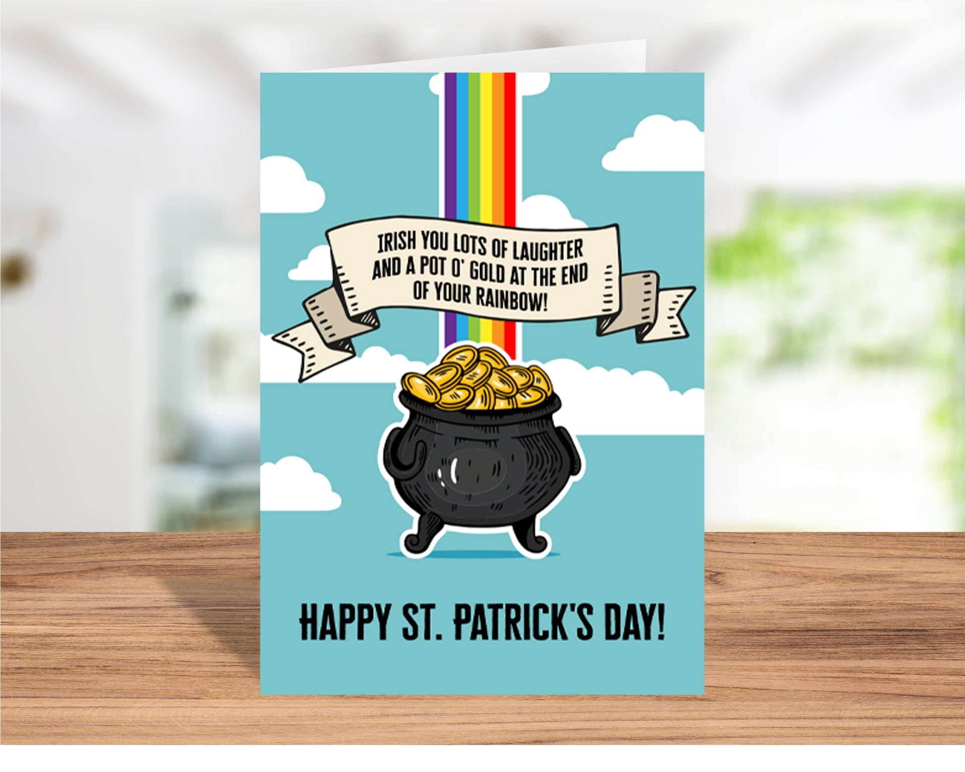 Send your warmest St. Patrick's Day wishes with our charming Irish Wishes Greeting Card. Featuring a delightful design with a rainbow and pot of gold, this St. Paddy’s Day greeting card includes a festive Irish saying to bring a smile to the recipient’s face. Whether near or far, share the luck of the Irish and spread the joy of the Emerald Isle with this cheerful festive Irish greeting card!