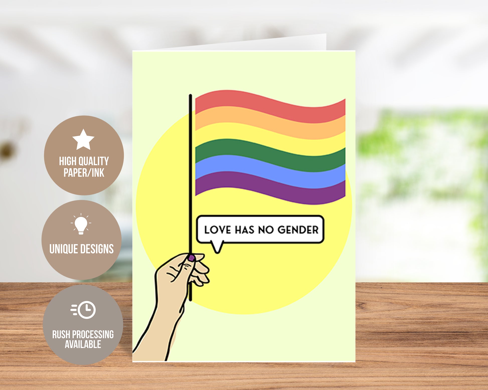 Celebrate love has no gender with our beautifully designed pride flag card. Perfect for weddings, anniversaries, or simply spreading love and inclusivity. Show your support for LGBTQ+ pride and equality with this heartfelt same-sex couple card—an ideal choice for those who believe in love is love.