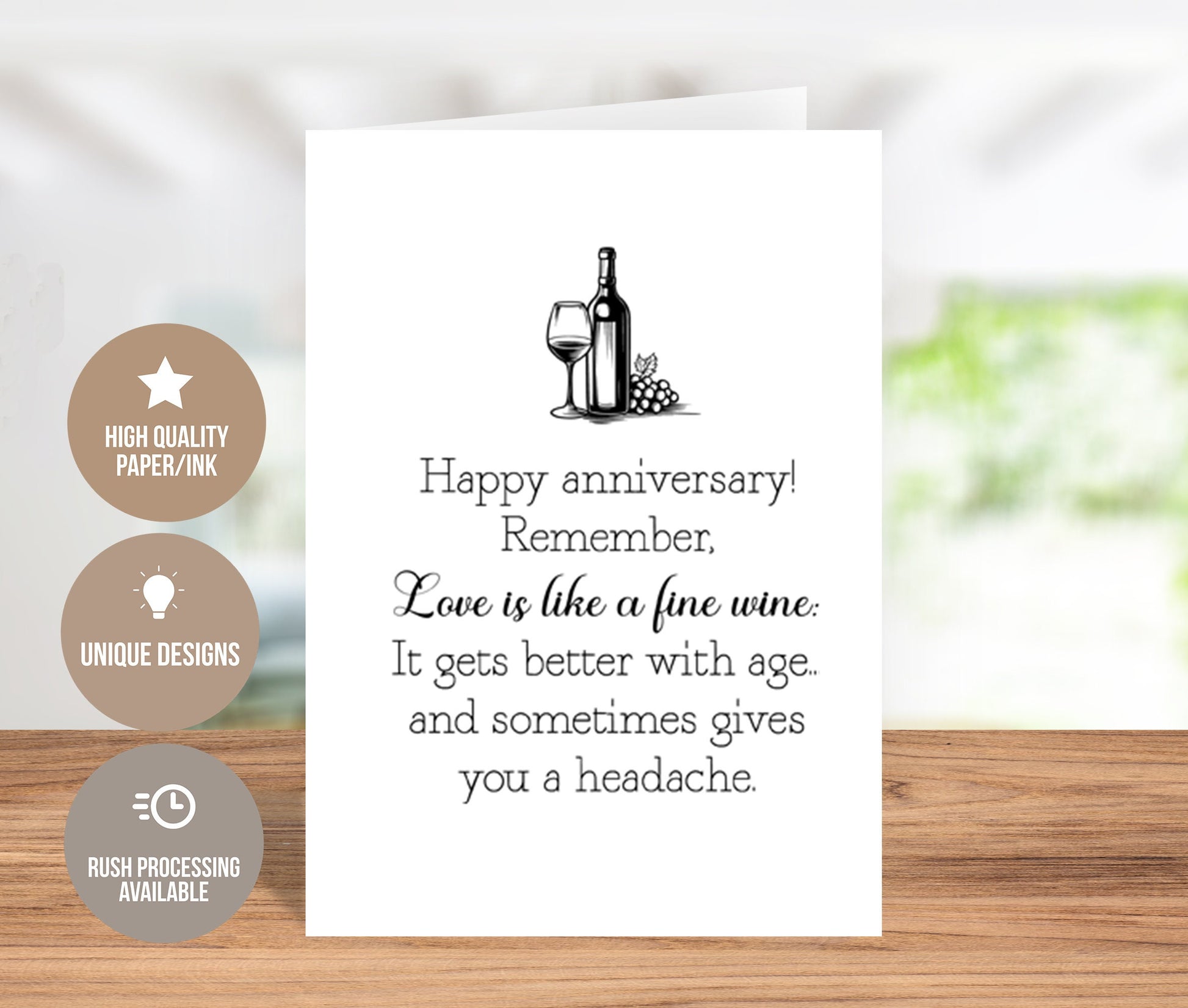 Toast to enduring love with this charming and humorous greeting card! Featuring a delightful message that reads, "Happy Anniversary! Remember Love is Like a Fine Wine: It Gets Better With Age... And Sometimes Gives You a Headache," this card blends warmth with a touch of humor to celebrate the journey of love.