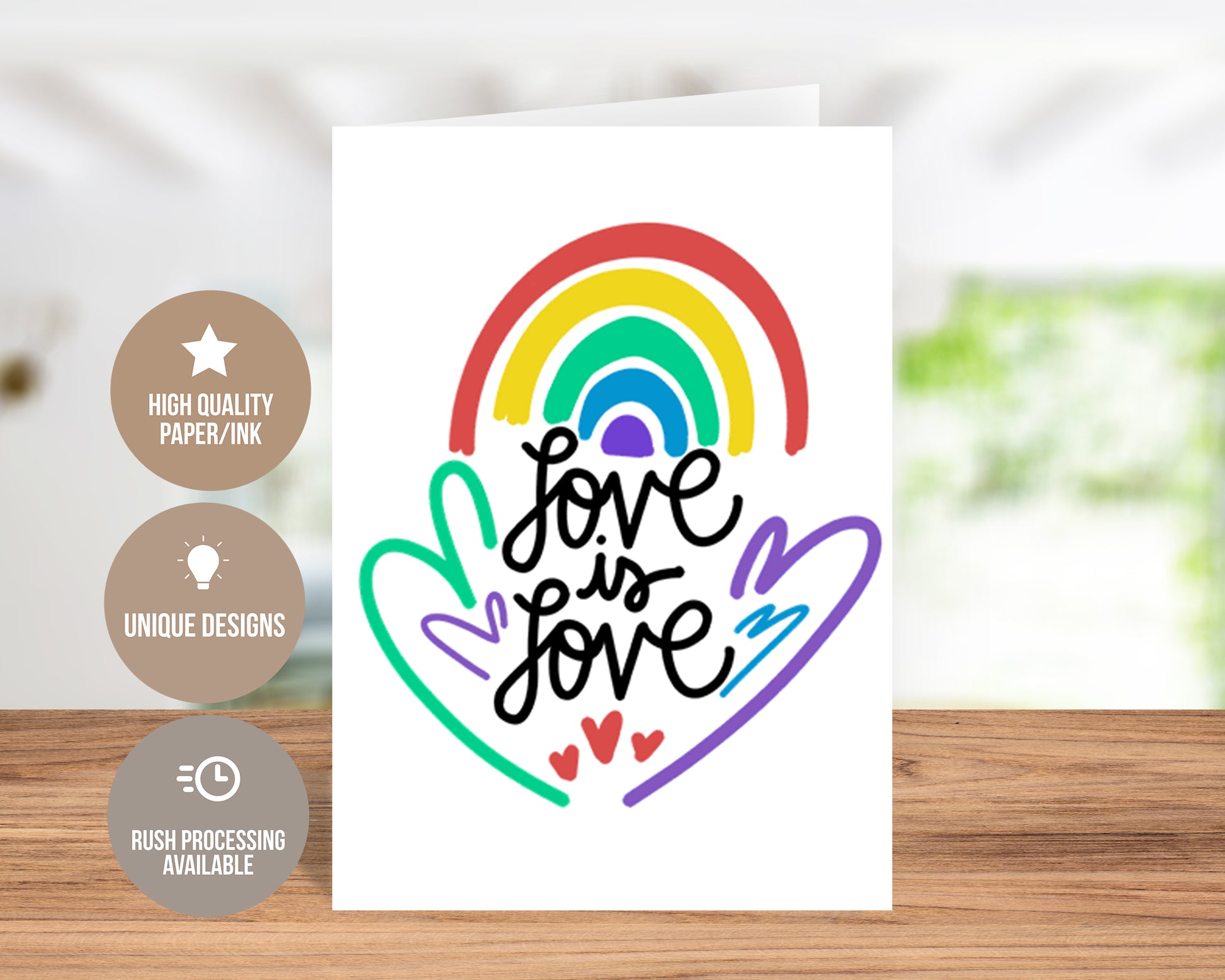 Its timeless design boasts elegant typography, with the bold "love is love" message set against soothing pastel colors. Crafted on high-quality cardstock with a matte finish, it blends sophistication and warmth effortlessly. <br><br> Inside, a blank canvas awaits your personal touch—plenty of room to write a heartfelt note celebrating inclusivity between partners, friends, or family. This isn’t just a card; it’s a powerful symbol of acceptance and unity, reflecting the boundless beauty of rainbow pride.