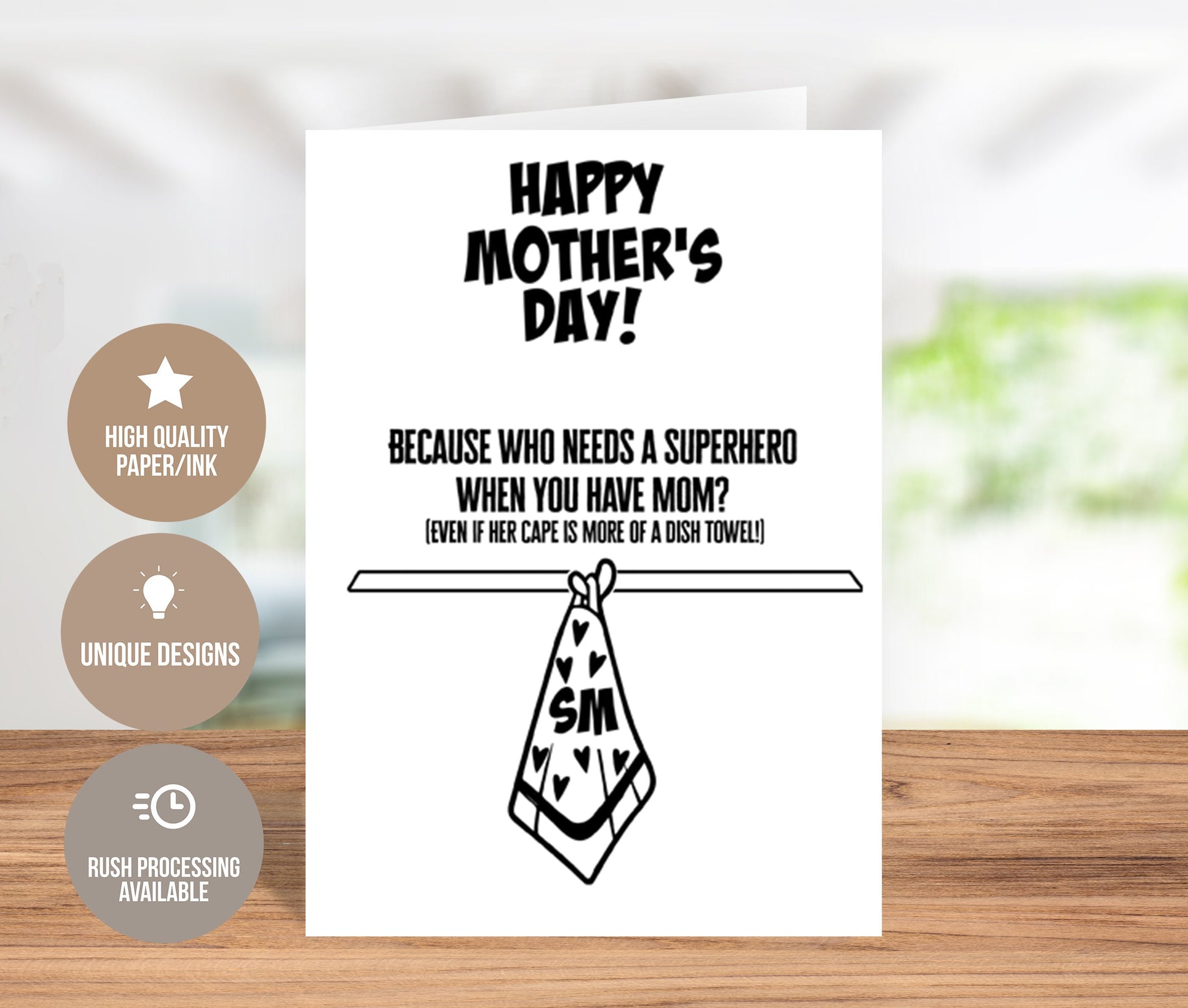 Celebrate the incredible strength and love of moms with this heartwarming Mother's Day greeting card! Featuring a touching message and adorable design, this card reminds us that moms are the true superheroes, even if their cape is more of a dish towel.
