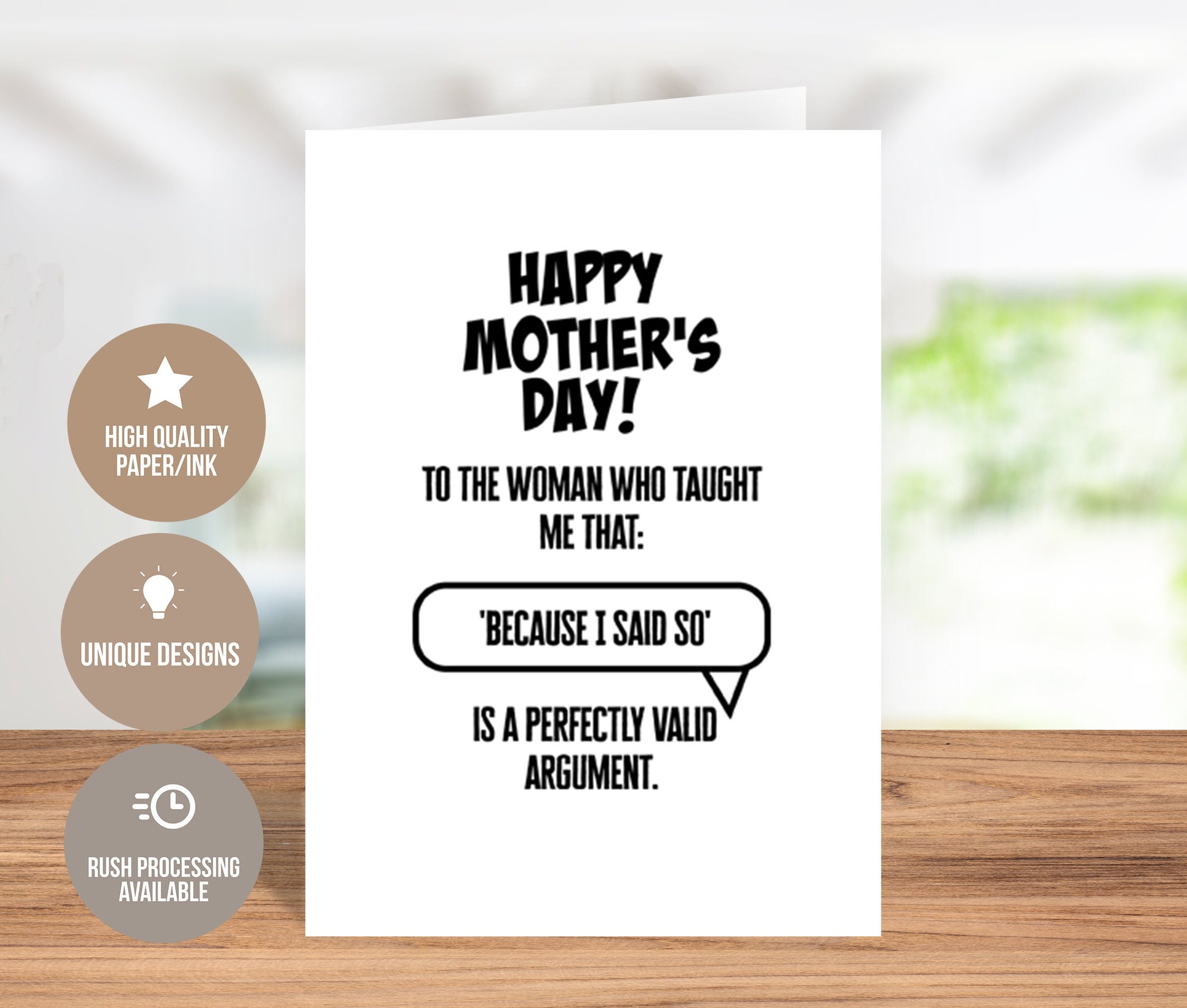 Celebrate the humor and wisdom of motherhood with this delightful Mother's Day greeting card! Featuring a playful message and a charming design, this card is the perfect way to honor the woman who taught you that "because I said so" is a valid argument.