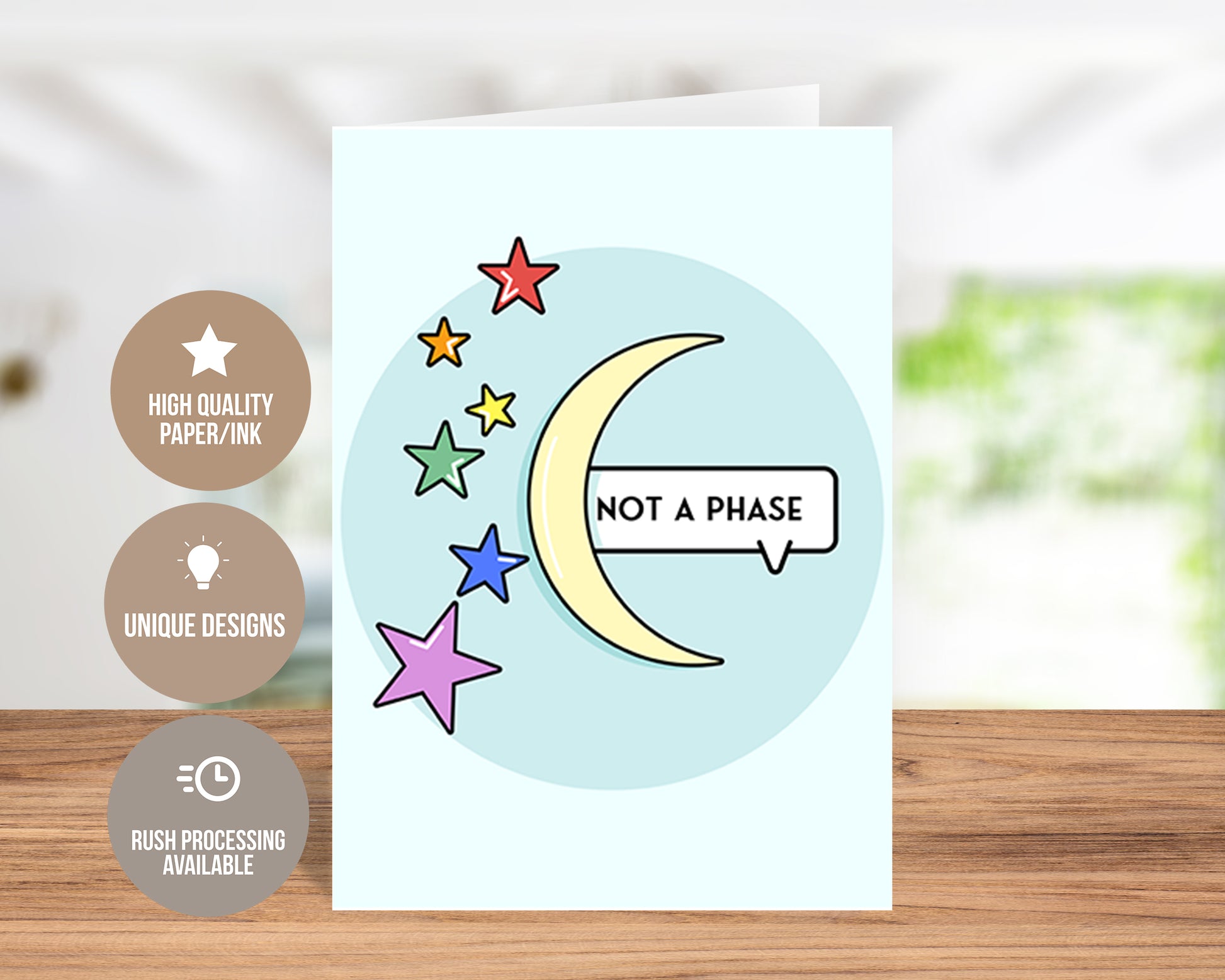 Celebrate self-discovery and authenticity with our gay pride greeting card – "Not A Phase." This LGBTQ greeting card is perfect for affirming and supporting loved ones on their journey of identity, showing that their truth is real and valid. Featuring a minimalist yet powerful design, the card boldly declares "Not A Phase" in sleek typography against a vibrant rainbow background.