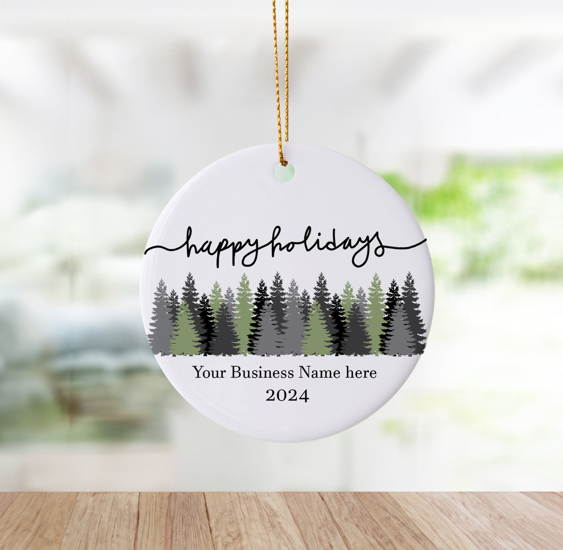 Spread holiday cheer with our custom "Happy Holidays" business ornament, featuring your company name and year for a truly personalized touch. This elegant Christmas ornament is perfect for adding festive flair to your office decor or as a thoughtful business gift. Whether you're looking for a client gift, an employee gift, or a unique piece of holiday decor for your workspace, this ornament is a beautiful addition to any Christmas tree. Celebrate the season in style with a custom ornament that brings merry Christmas vibes to your business, making it an ideal personalized gift for the holiday season.