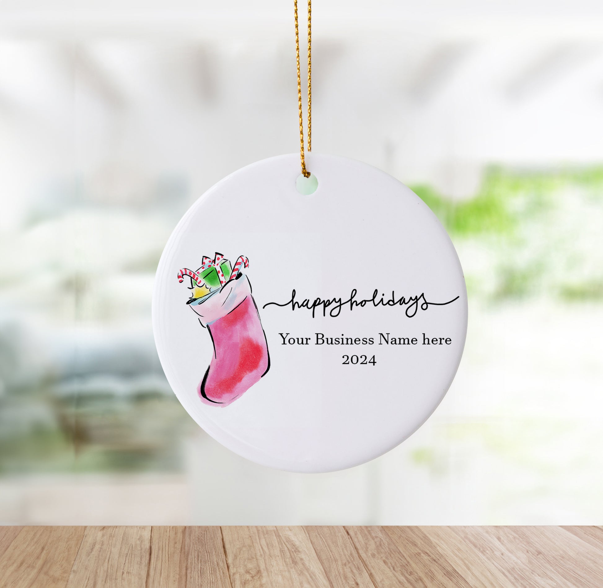 Celebrate the season with our "Happy Holidays" ceramic ornament, customized with your business name and year. This elegant holiday ornament is the perfect addition to your Christmas tree decor and makes a thoughtful business gift. Whether you're looking for a unique client gift or a personalized employee gift, this custom ornament adds a special touch to any holiday celebration. Spread the merry Christmas spirit with a personalized gift that captures the essence of the season, making it a memorable Christmas ornament for your business and beyond.
