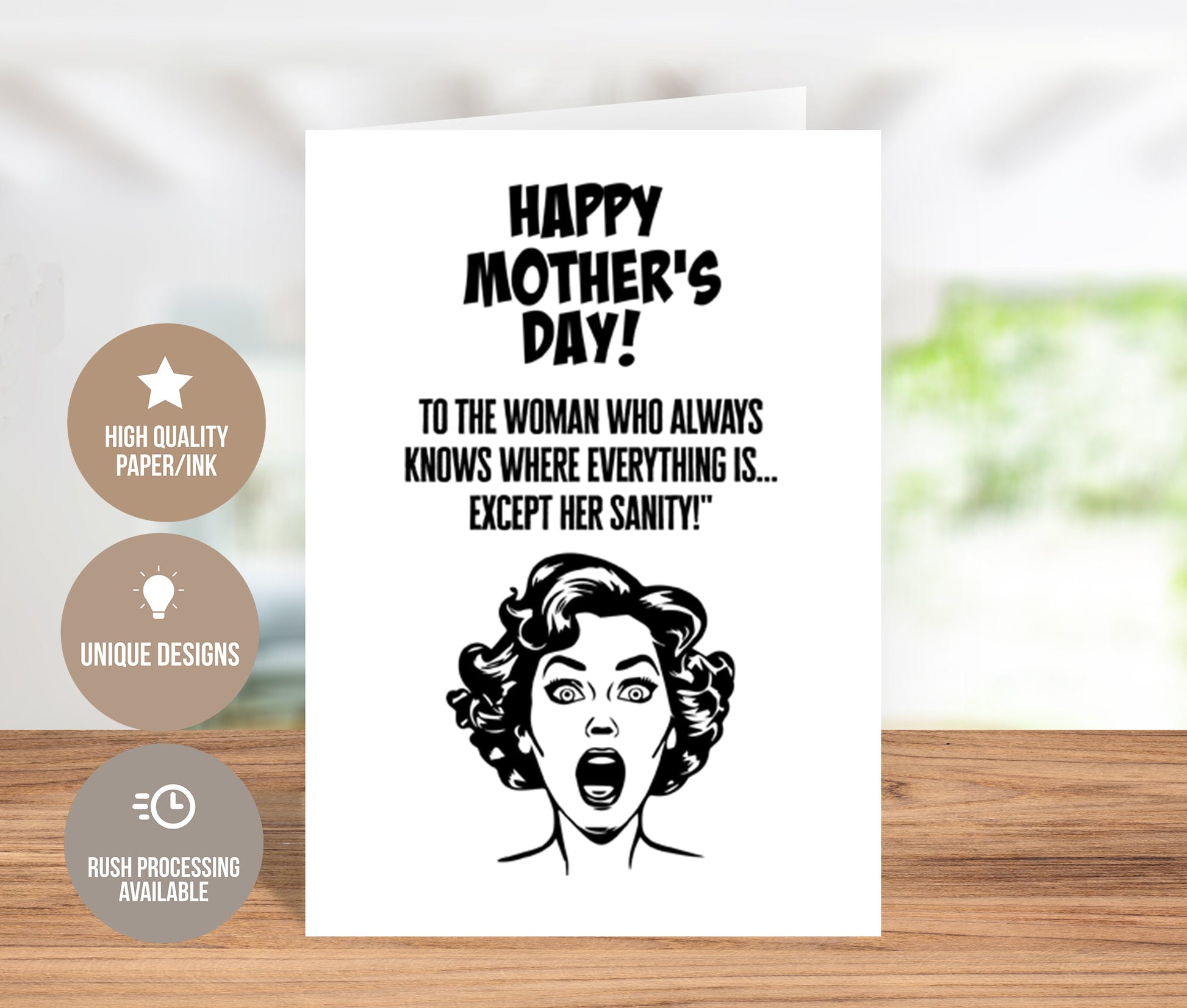 Celebrate the multitasking marvel and occasional chaos of motherhood with this humorous Mother's Day greeting card! Featuring a witty message and charming design, this card is perfect for honoring the woman who always knows where everything is.... except her sanity.