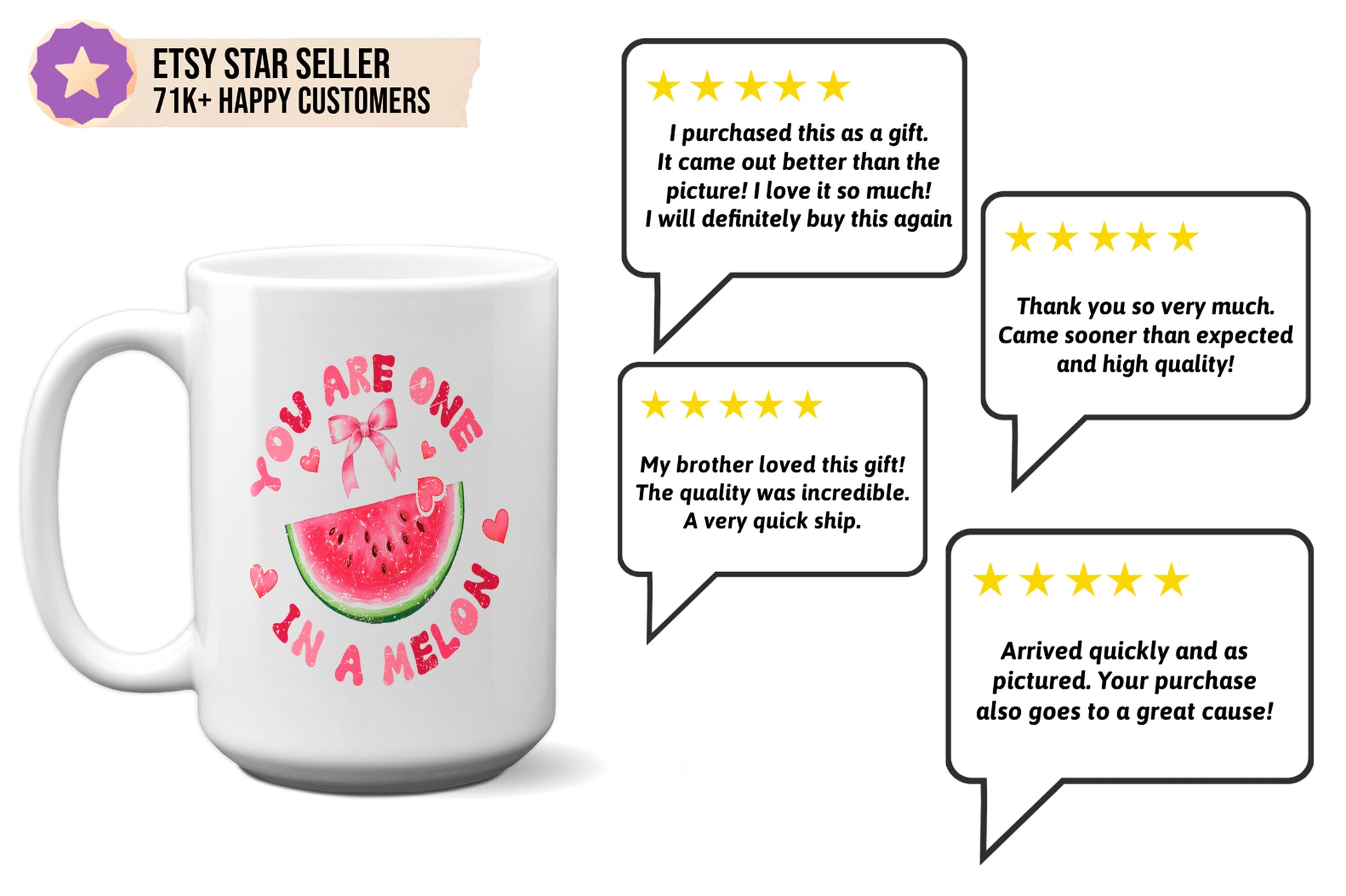 Celebrate the sweetness of love with our "You Are One in a Melon" mug, featuring a fun watermelon design! This handmade keepsake is the perfect "Be Mine" gift for her, him, or a delightful surprise for a friend. Ideal for coffee lovers and couples, this unique Valentine’s mug brings a burst of charm and whimsy to your Valentine’s Day celebration. Whether paired with coffee and donuts or kept as a treasured keepsake, this mug is a playful and heartwarming way to show someone special that they’re one in a million this Valentine’s Day!