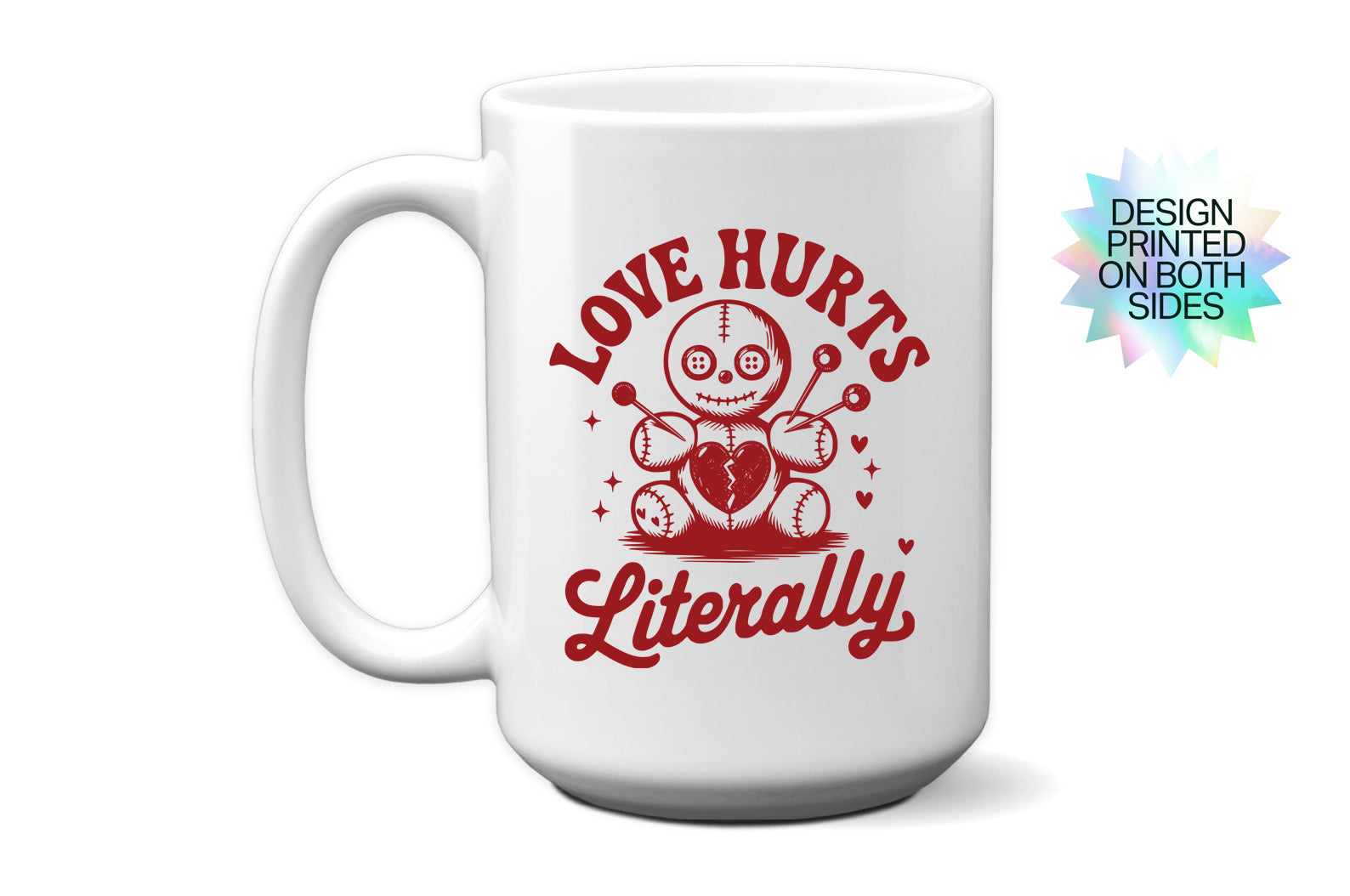Fun "Love Hurts (Literally)" Voodoo Doll Valentine’s Day Mug.