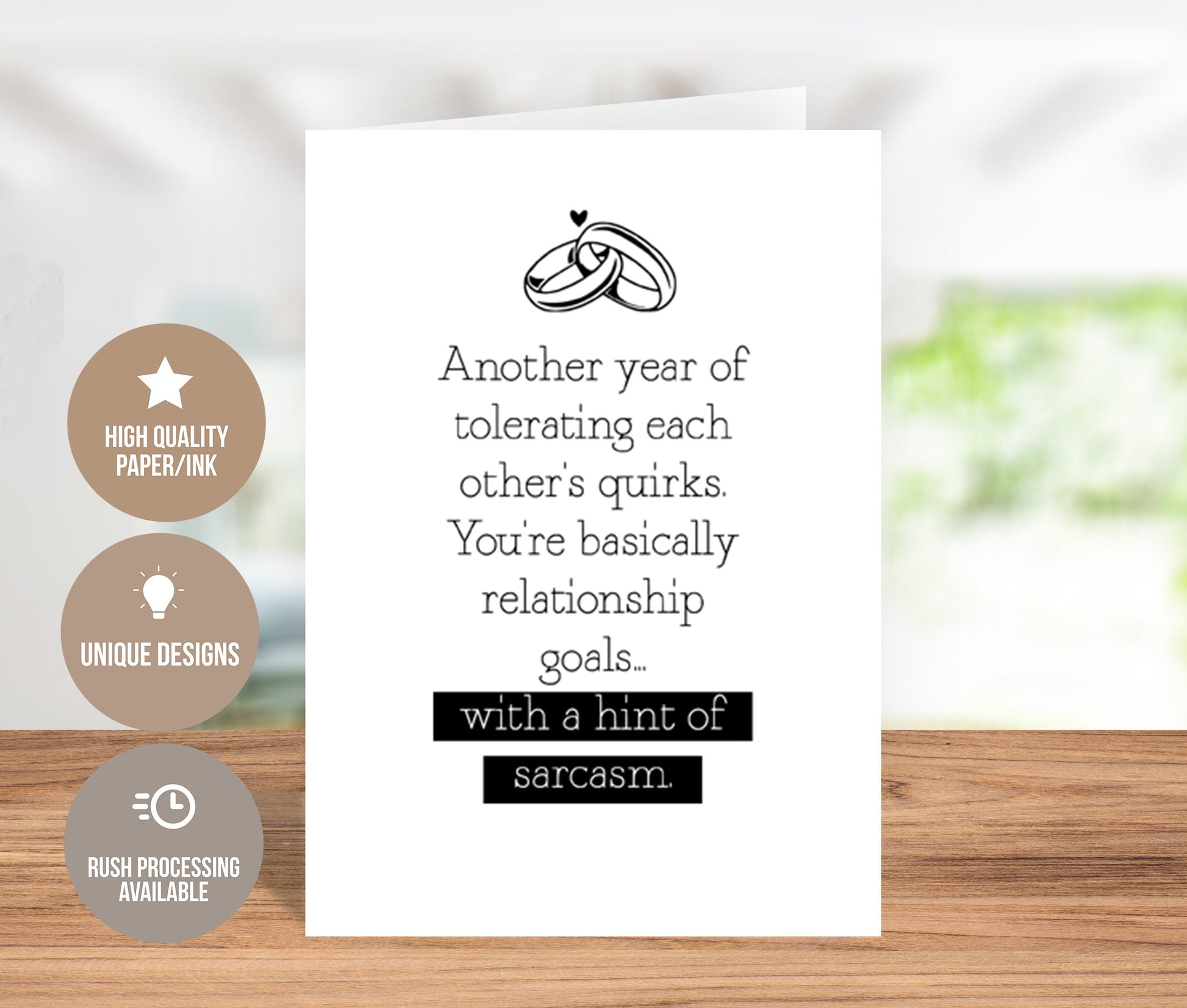 Celebrate another year of love, quirks, and lightheartedness with this humorous greeting card! Featuring a witty message that reads, "Another Year of Tolerating Each Other’s Quirks: You’re Basically Relationship Goals... with a Hint of Sarcasm," this card is perfect for couples who love to laugh.