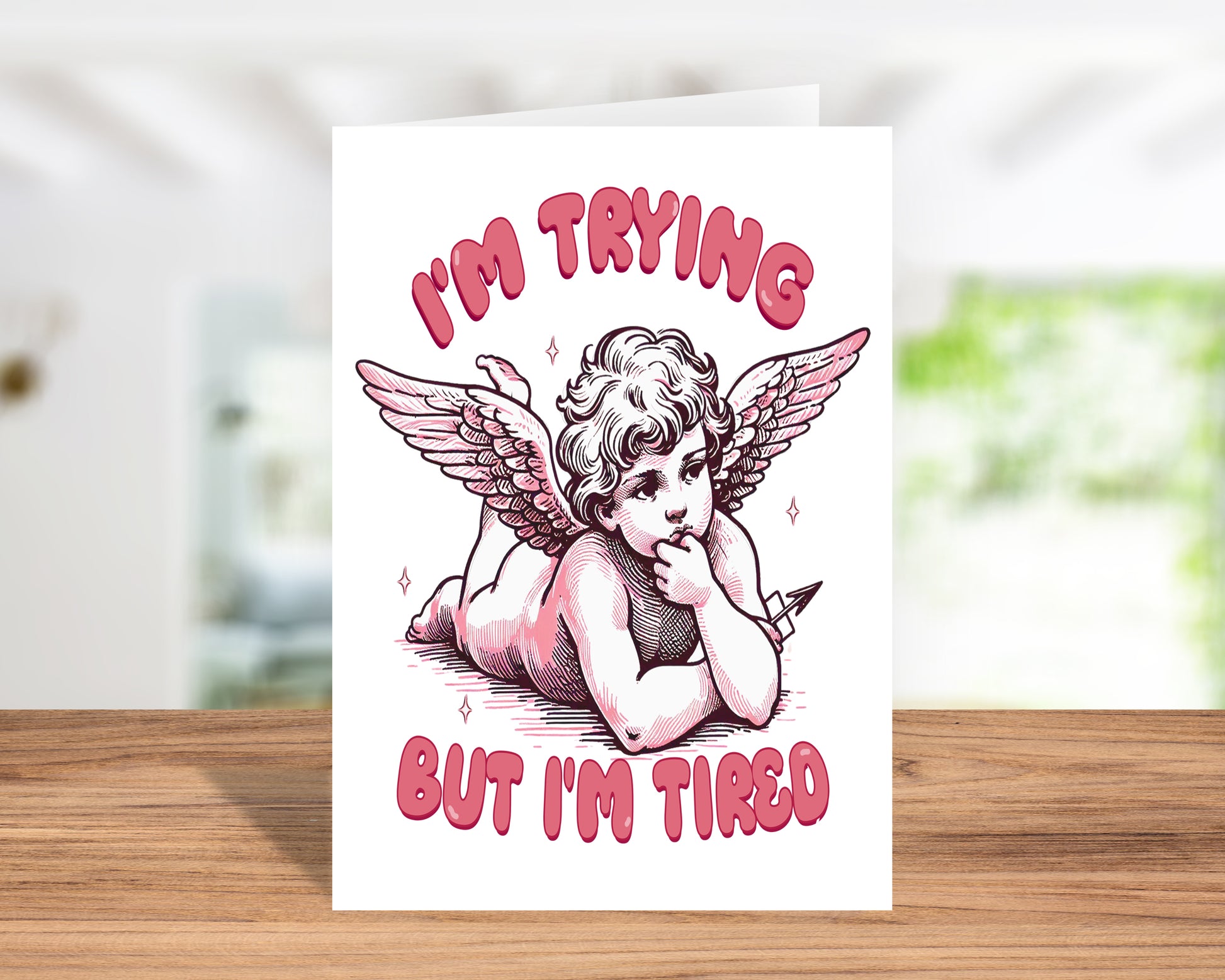 For the ones who love deeply, even when they’re tired—this handmade Valentine’s Day card featuring Cupid and the honest message, "I'm Trying But I'm Tired," is a heartfelt and relatable way to express love. Perfect for your boyfriend, girlfriend, or loved one, this card blends humor and tenderness to remind them that "Love is Love." Whether it’s for Valentine’s Day, an anniversary, or just a moment of appreciation, this unique greeting card is a meaningful way to say "Be Mine" and share your heart.