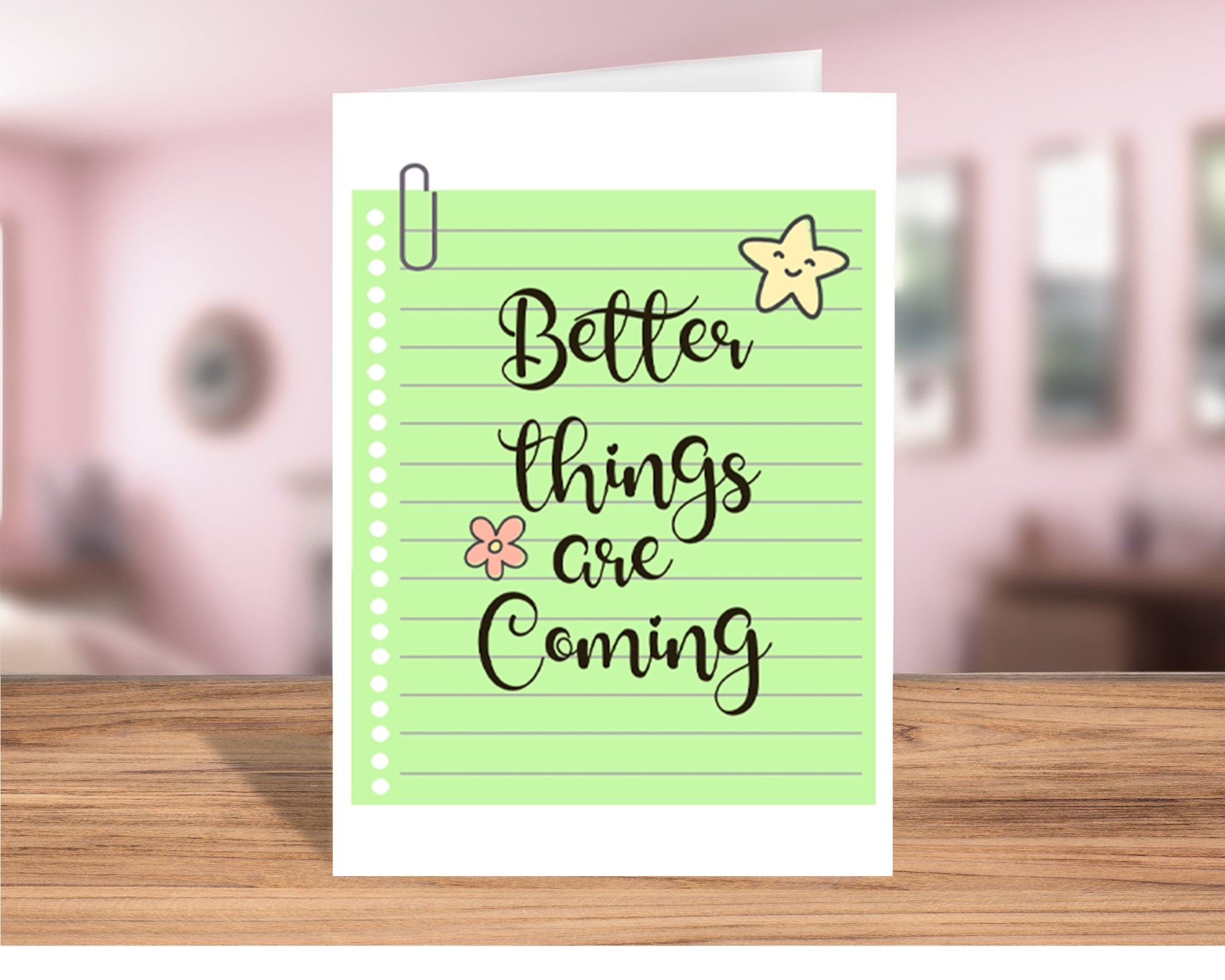 Offer hope and encouragement with our "Better Things Are Coming" greeting card. This heartfelt card is perfect for a boyfriend, girlfriend, mentor, or anyone in need of a positive reminder. Whether it’s a Valentine’s Day card, a recovery card, or a thoughtful gift for her or him, this unique design radiates optimism and self-love. Ideal for moments of support and reassurance, it’s a meaningful way to inspire someone to keep moving forward with confidence and resilience. Share a message of hope and belief in brighter days ahead with this uplifting and inspirational card.