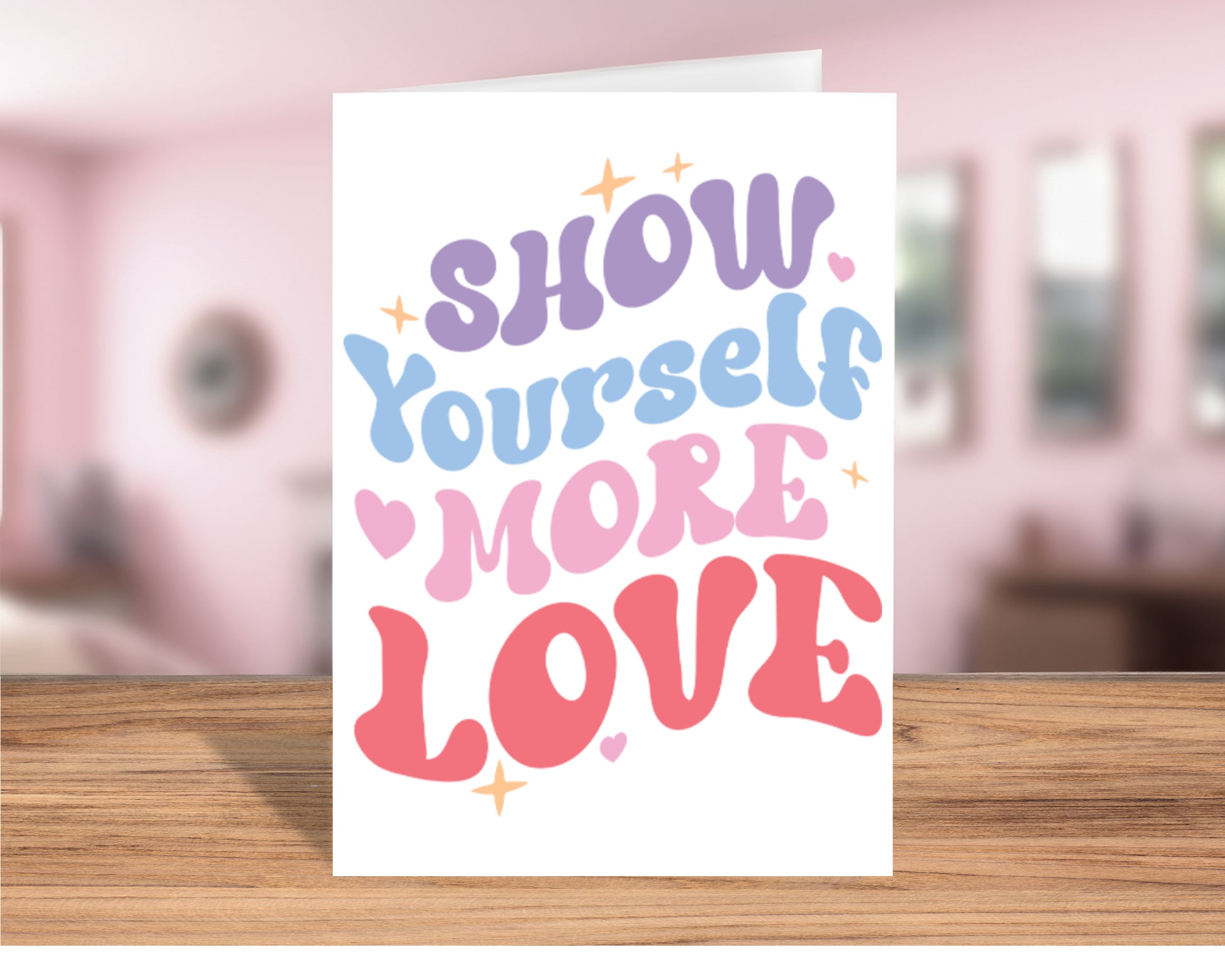 Encourage someone special to prioritize their well-being with our "Show Yourself More Love" greeting card. Perfect for a boyfriend, girlfriend, mentor, or anyone who needs a gentle reminder to practice self-love, this card delivers a heartfelt message of care and encouragement. Whether it’s for Valentine’s Day, a recovery card, or a thoughtful gift for her or him, this unique design inspires self-compassion and positivity. Share a meaningful message that celebrates the importance of loving and valuing oneself with this beautifully designed inspirational card, perfect for any occasion.