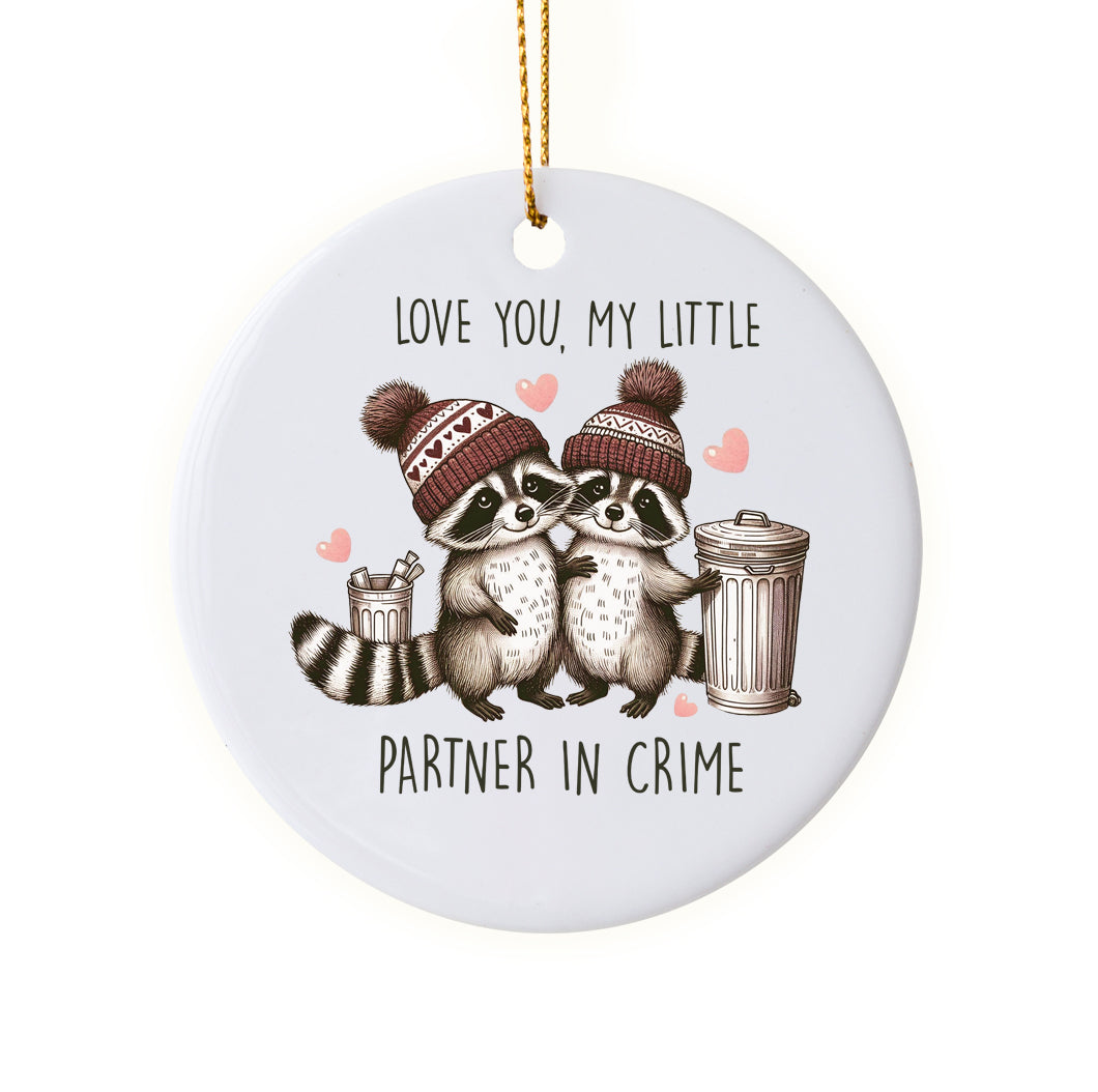 Cute "Love You, My Little Partner in Crime" Raccoon Holiday Ornament.
