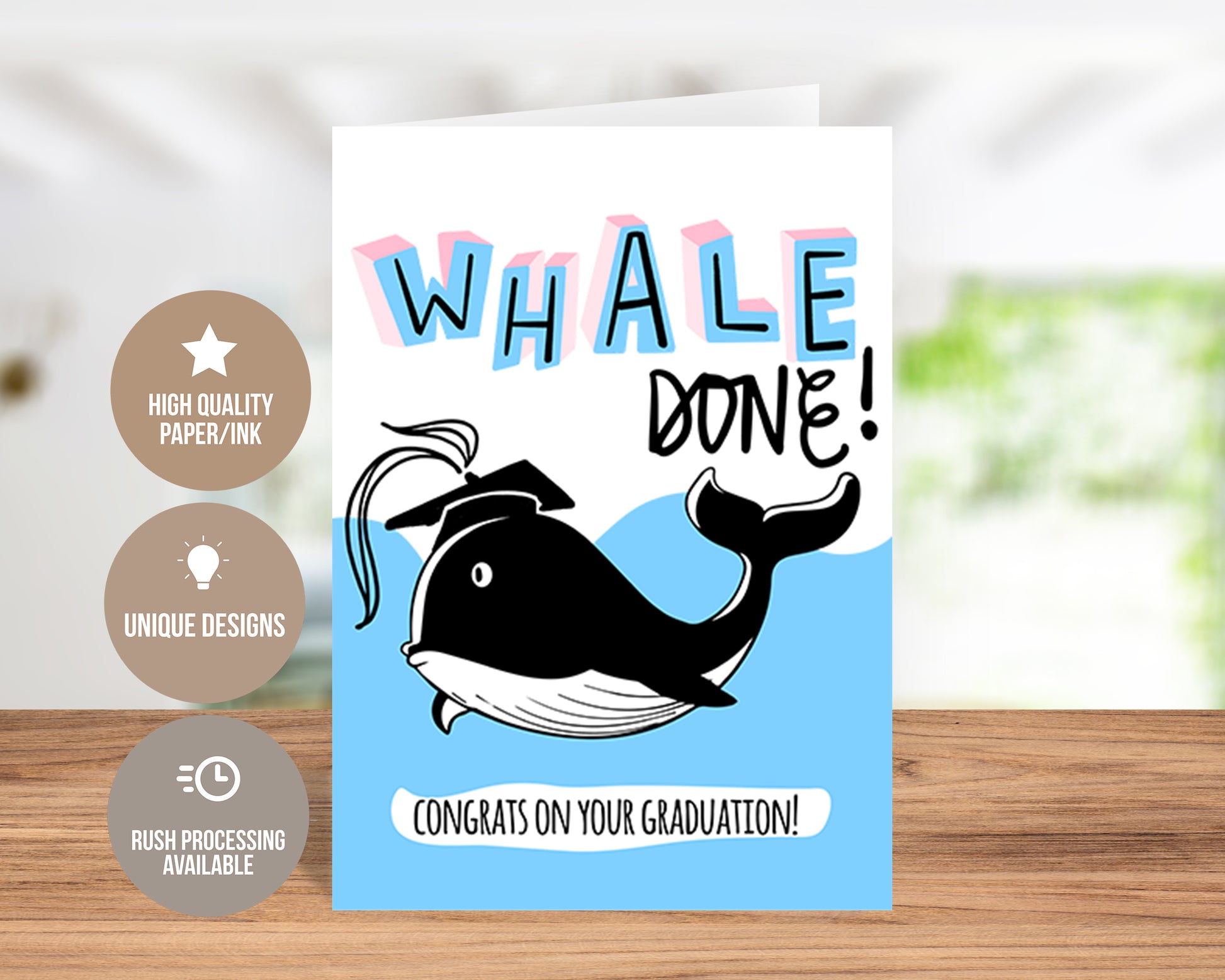 Make a splash and celebrate success with our Whale Done Congrats Grad traditional graduation card. This joyful and whimsical graduation card is the perfect way to say “Congrats Grad” with charm and heart. Made from premium cardstock, it features a cheerful design and a lovable whale illustration, creating a beautiful graduation keepsake.