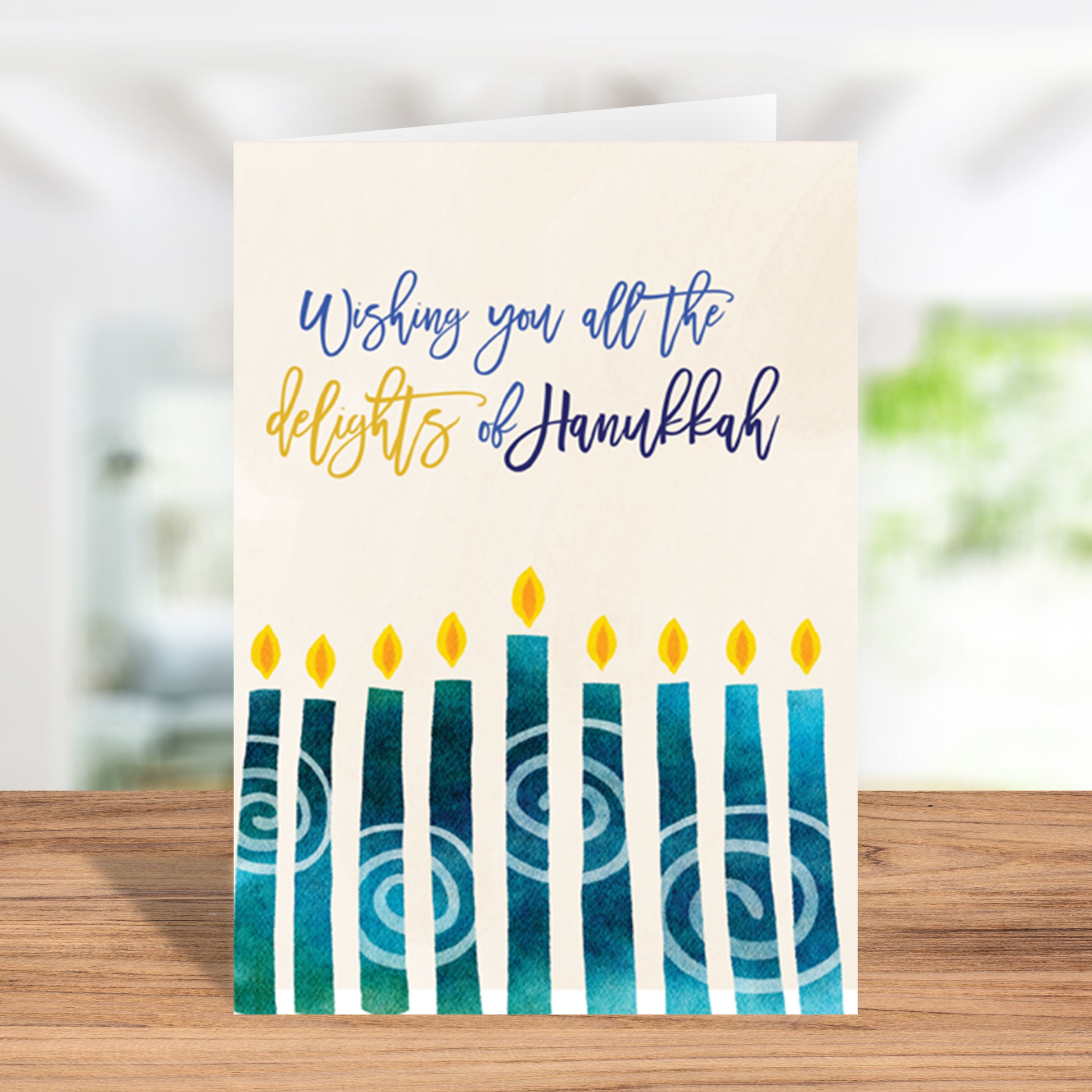 Ring in the holidays with our Hanukkah Greeting Card featuring the message "Wishing You All The Delights Of Hanukkah." This Happy Hanukkah Menorah Card is a perfect way to send warm wishes to family and friends as you celebrate the joyous season. Whether you're sharing it as a Happy Hanukkah card, a Jewish holiday card, or as a thoughtful Hanukkah gift, this card is a beautiful way to express your heartfelt Hanukkah greetings.